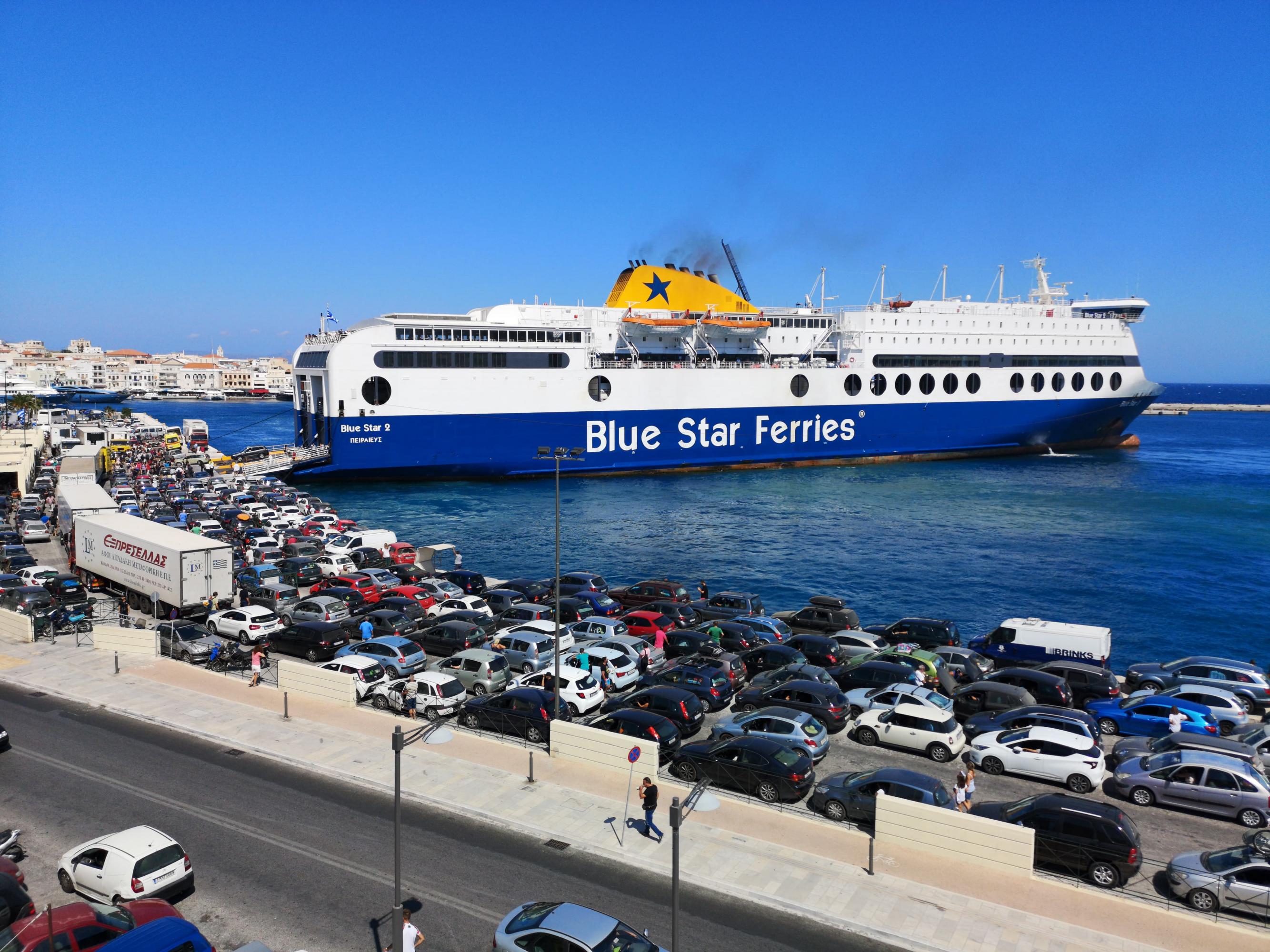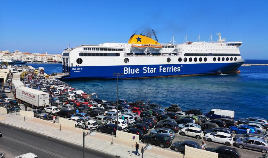 Οι εικόνες αφορούν στο μεσημεριανό δρομολόγιο του Blue Star 2 με προορισμό το λιμάνι του Πειραιά και όπως διαπιστώνεται τα οχήματα και τα δίκυκλα έχουν κατακλύσει τον εσωτερικό χώρο του λιμανιού.