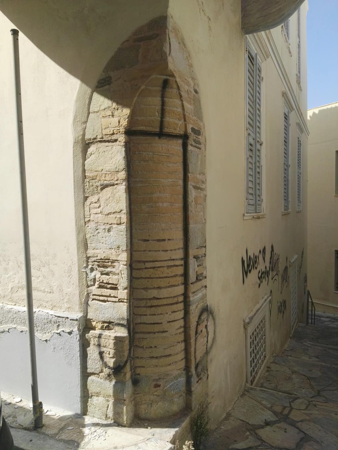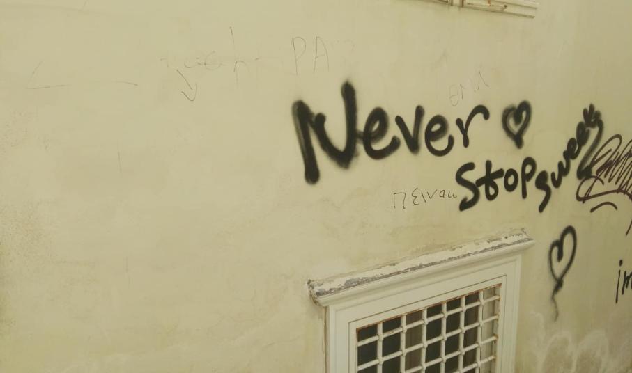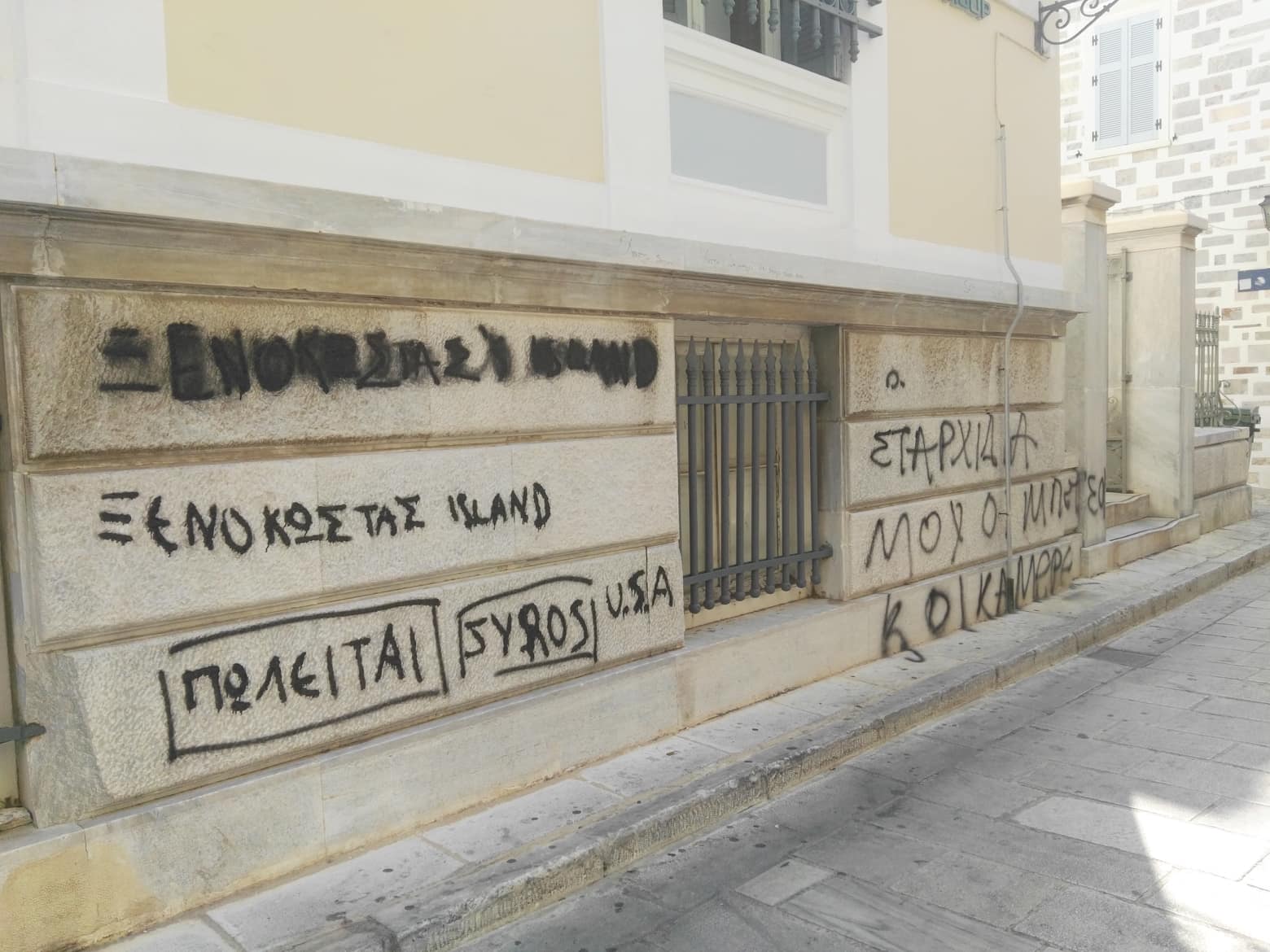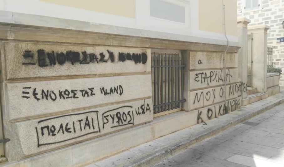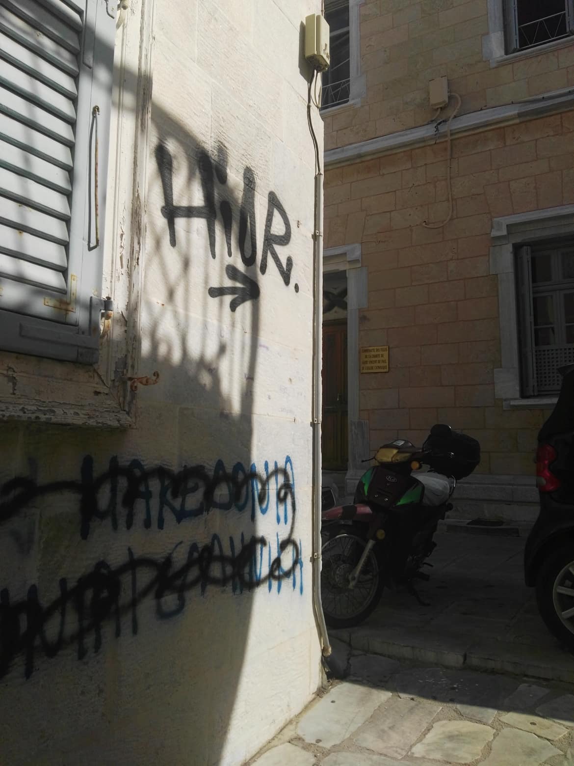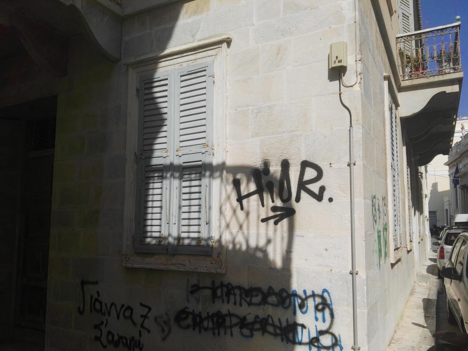 Βωμολοχία, συνθήματα αλλά και ανόητες αναφορές αποτύπωσαν για ακόμη μία φορά ανεκδιήγητοι στο κέντρο της Ερμούπολης, με “θύμα” τα όμορφα νεοκλασικά της πόλης, που δέχθηκαν ξανά επίθεση... αισθητικής υποβάθμισης.