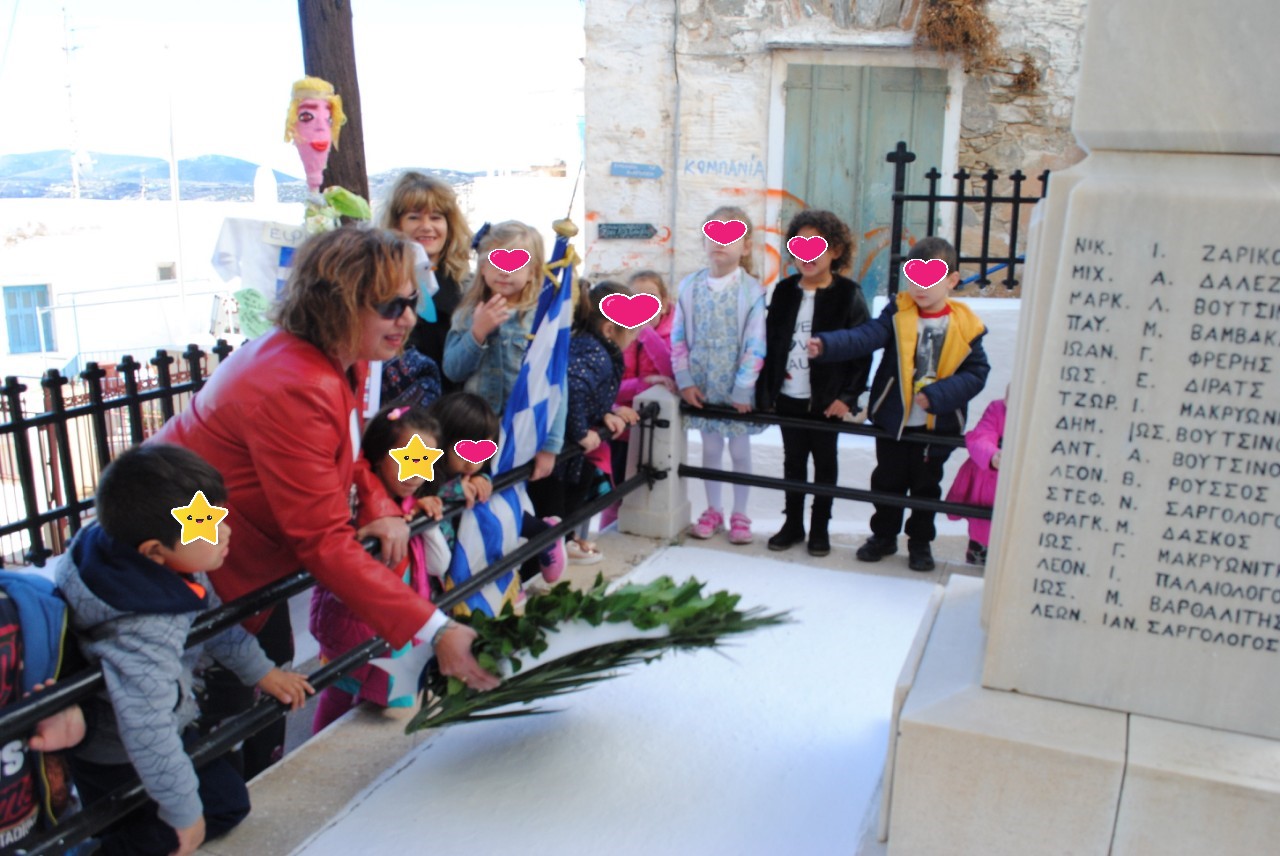 Τα παιδιά του Νηπιαγωγείου μας στα πλαίσια του εορτασμού της εθνικής επετείου έφτιαξαν της δικές τους κούκλες την «Ελλαδίτσα» και την «Ειρήνη» και μαζί τους στεφάνωσαν την Παρασκευή με τις δασκάλες τους στο Μνημείο Πεσόντων Αγωνιστών στον λόφο της Άνω Σύρου.