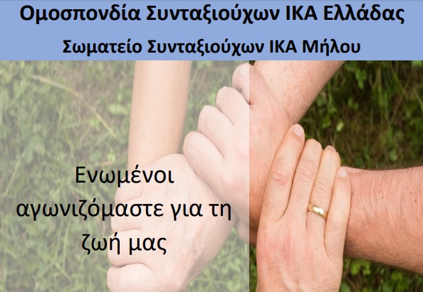 Όλοι στη συγκέντρωση του Σωματείου Συνταξιούχων ΙΚΑ Μήλου το Σάββατο 17/11 6 μμ. Θα παρευρεθούν και θα μιλήσουν εκ' μέρους της Ομοσπονδίας Συνταξιούχων ΙΚΑ Ελλάδας ο γενικός Γραμματέας Ραλλάκης Μανώλης και ο αναπληρωτής γραμματέας Μάκκας Λέανδρος. Όλοι ενωμένοι στη διεκδίκηση της ζωής μας.