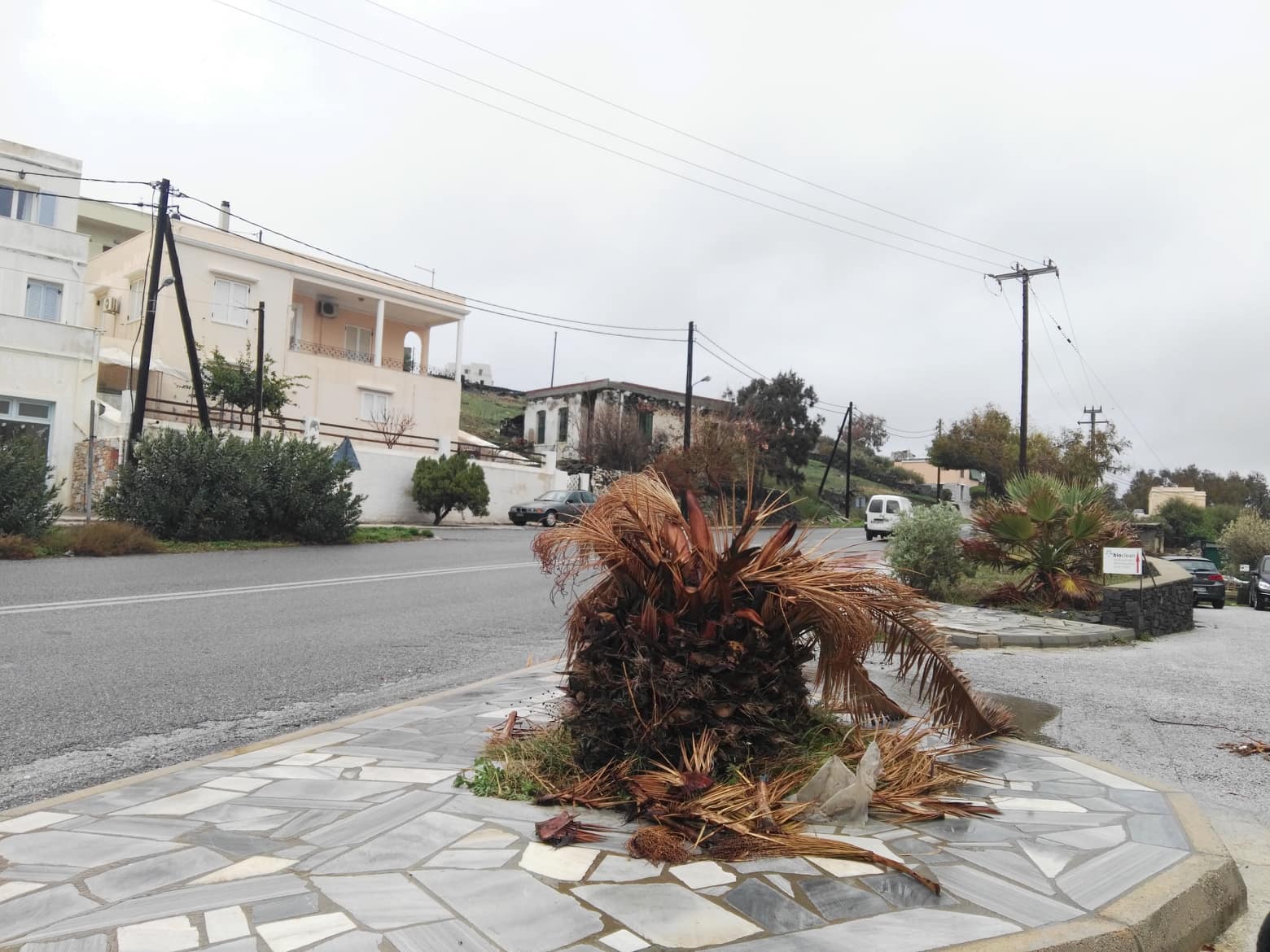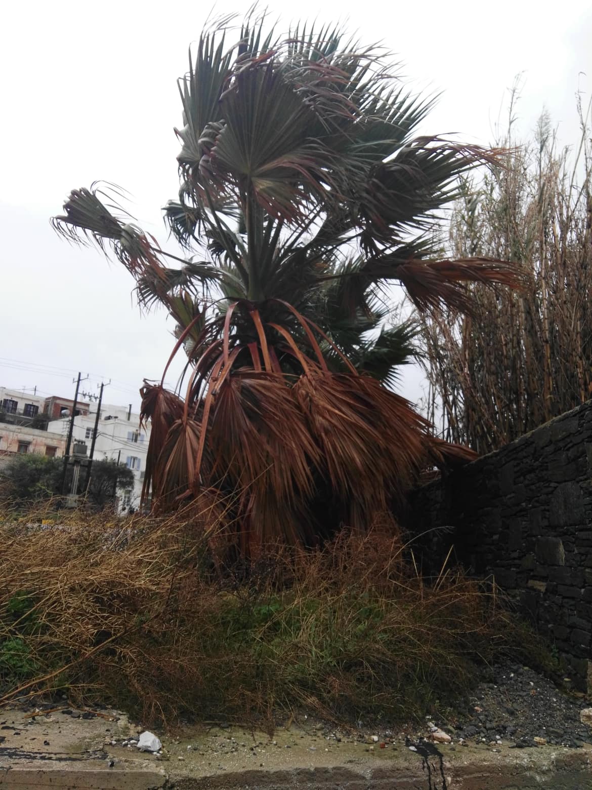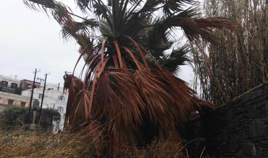 Όπως αποτυπώνεται στο σχετικό φωτογραφικό υλικό, πρόκειται για την απόλυτη καταστροφή τους, αφού όχι μόνον τσάκισαν κι αποκόπηκαν κλαδιά από τους “κορμούς” τους, αλλά συνολικά τα φοινικοειδή, απέκτησαν εικόνα πλήρους μαρασμού.