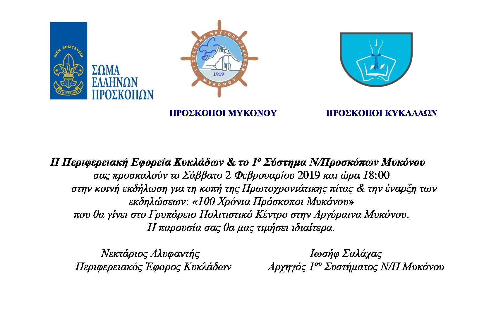 Πρόσκληση για την κοπή της πίτας της ΠΕ Κυκλάδων και της έναρξης των εκδηλώσεων "100 χρόνια Πρόσκοποι Μυκόνου" η οποία θα γίνει στις 2/2/2019 στο Γρυπάρειο Πολιτιστικό Κέντρο Μυκόνου.