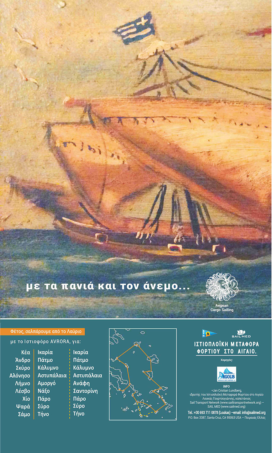 Η μη κερδοσκοπική οργάνωση SAILMED.ORG αναβιώνει την «Ιστιοπλοϊκή Μεταφορά Φορτίου στο Αιγαίο» (AEGEAN CARGO SAILING), μία καινοτόμο δια – νησιακή υπηρεσία που τιμά την Αιγαιοπελαγίτικη παράδοση των πανιών και του ανέμου. Η ομάδα εφαρμόζει, ήδη, από το περασμένο καλοκαίρι αυτόν τον καθαρό τρόπο εμπορικής, πολιτιστικής σύνδεσης και μεταφοράς αγαθών στα νησιά. Επιπλέον, το χειμώνα μετέφερε προϊόντα του Αιγαίου στην Ιταλία και τη Γαλλία μόνο με το πανί και τον άνεμο. Οι χερσαίες διαδρομές, όπου αυτό είναι εφικτό γίνονται με ποδήλατο ή ηλεκτροκίνητο αυτοκίνητο (με ηλιακή φόρτιση), ενώ από φέτος ταξιδεύει με το σκάφος ένα ξύλινο ποδήλατο, χορηγία της coco-mat.bike, το οποίο χρησιμοποιείται για τις μεταφορές των προϊόντων στην ξηρά.