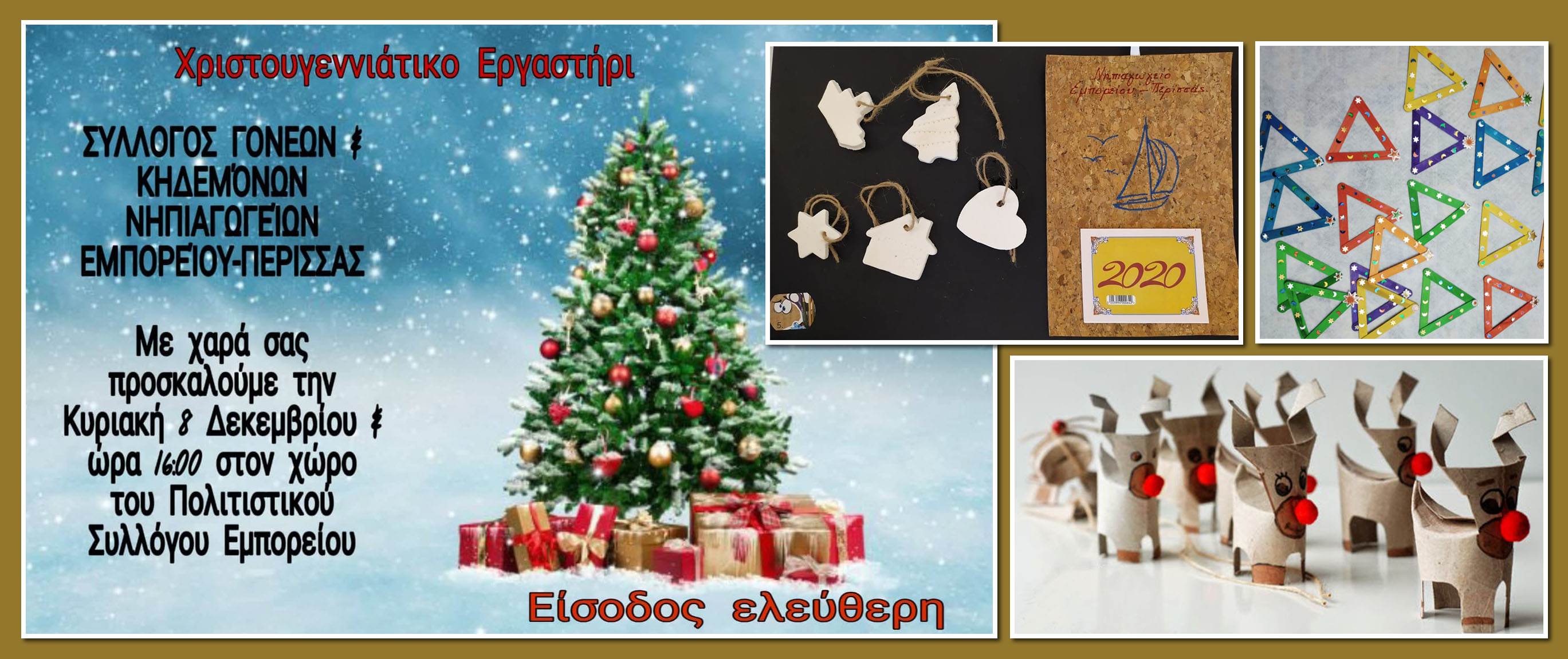 Έτσι στο Χριστουγεννιάτικο Εργαστήρι την Κυριακή 8 Δεκεμβρίου που θα πραγματοποιηθεί στον Πολιτιστικό Σύλλογο του Εμπορείου από τις 16.00 έως τις 20.00, όλες οι κατασκευές θα γίνουν με ανακυκλώσιμα και φιλικά προς το περιβάλλον υλικά. Βασικός στόχος του Συλλόγου είναι η ανάδειξη πρακτικών και λύσεων με οικολογικό αποτύπωμα, φέρνοντας κοντά και τα μικρά παιδία προσχολικής ηλικίας.