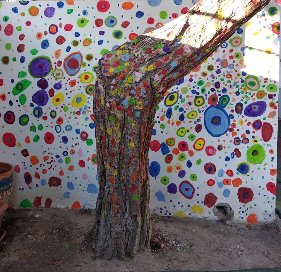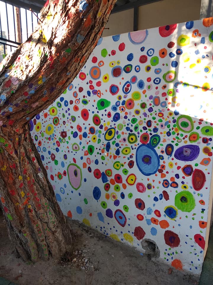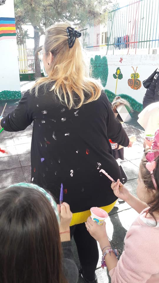 Κίτρινες, πορτοκαλί, κόκκινες, μπλε και πράσινες κουκκίδες φώτισαν τους λευκούς τοίχους εκτός των αιθουσών του Σχολείου, ενώ οι μικροί ανήσυχοι καλλιτέχνες θέλησαν να “στολίσουν” και τη ζακέτα της αγαπημένης δασκάλας τους.