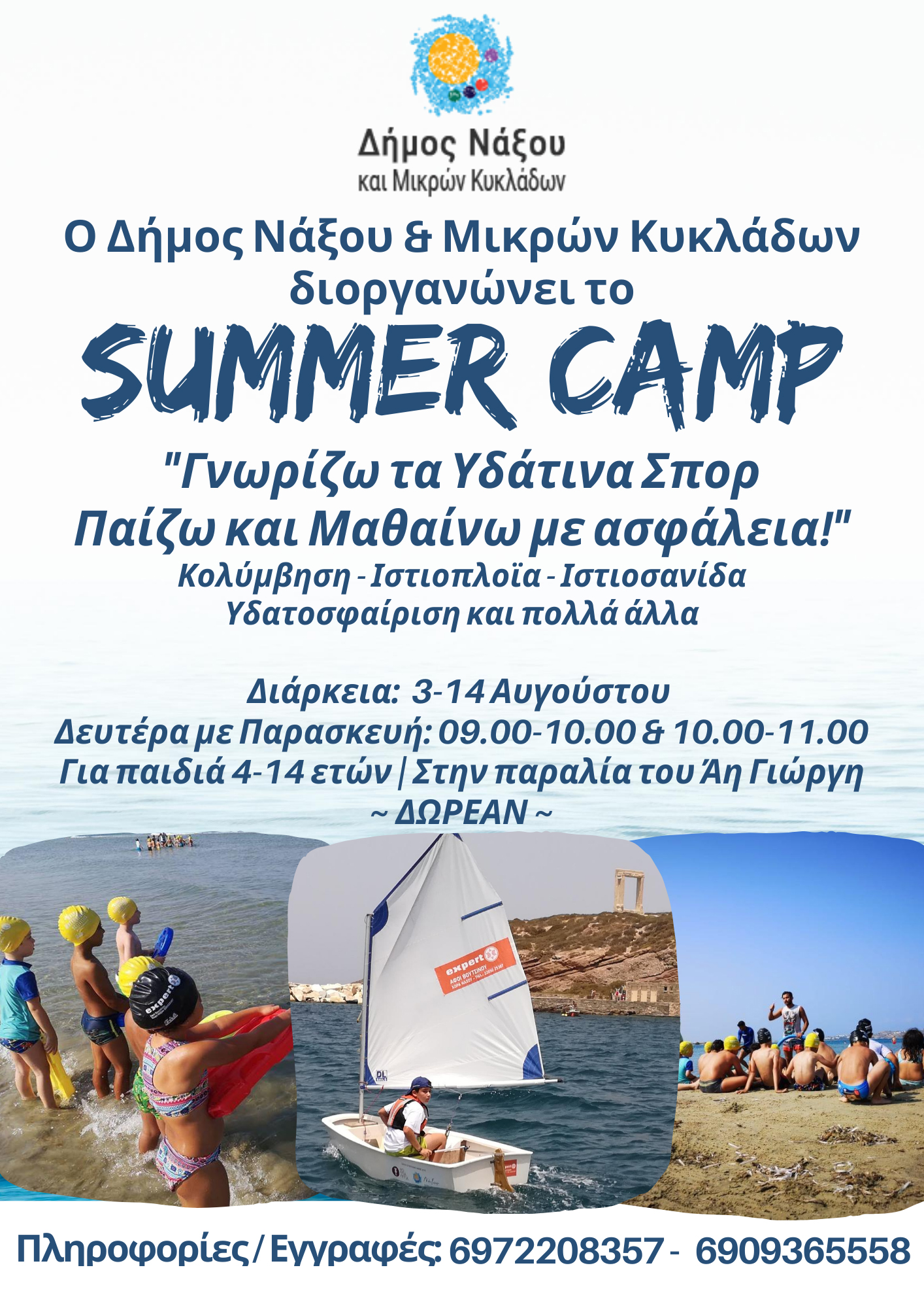 Summer camp από τον Δήμο Νάξου και Μικρών Κυκλάδων Τετάρτη 29 Ιουλίου 2020 - 10:45 Summer camp διοργανώνει ο Δήμος Νάξου και Μικρών Κυκλάδων από 3 έως και 14 Αυγούστου. Διαφήμιση Δείτε αναλυτικά στην αφίσα. #Κοινωνικά #Summer Camp