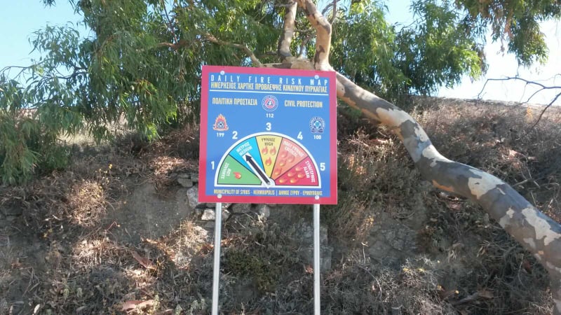 Ημερήσιους χάρτες πρόβλεψης κινδύνου πυρκαγιάς απέκτησε η Σύρος, σε κεντρικούς περιφερειακούς δρόμους προκειμένου να ενημερώνονται οι κάτοικοι και οι επισκέπτες του νησιού για τον βαθμό του κινδύνου που “αναδύεται” καθημερινά πλέον σχετικά με την πρόκληση φωτιάς.
