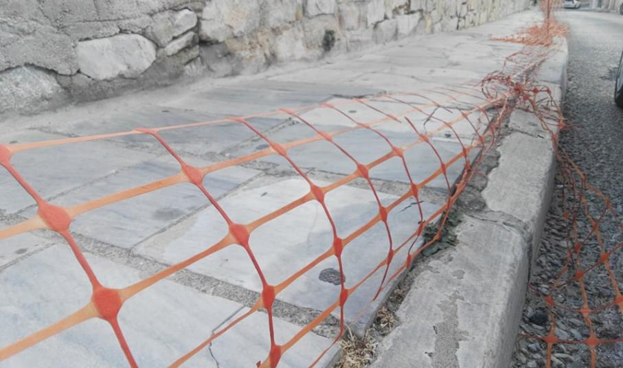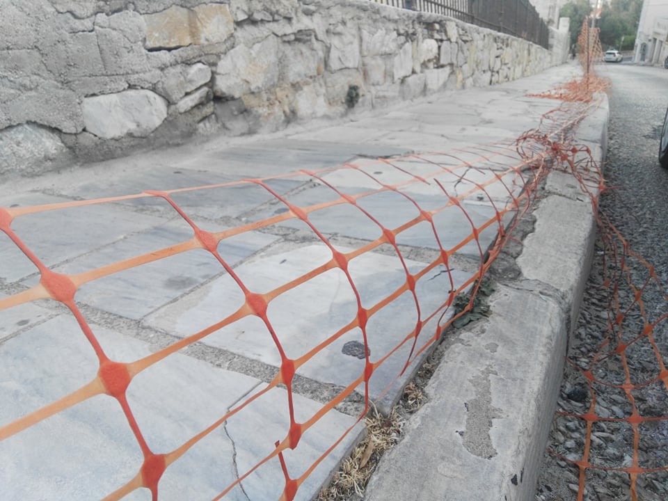 Ειδικότερα, το πορτοκαλί πλέγμα έχει μετατοπιστεί από την αρχική θέση του, ενώ οι ιδιαιτέρως επικίνδυνες μπετόβεργες επί των οποίων στηριζόταν, έχουν αποκτήσει απότομη κλίση προς τον δρόμο.