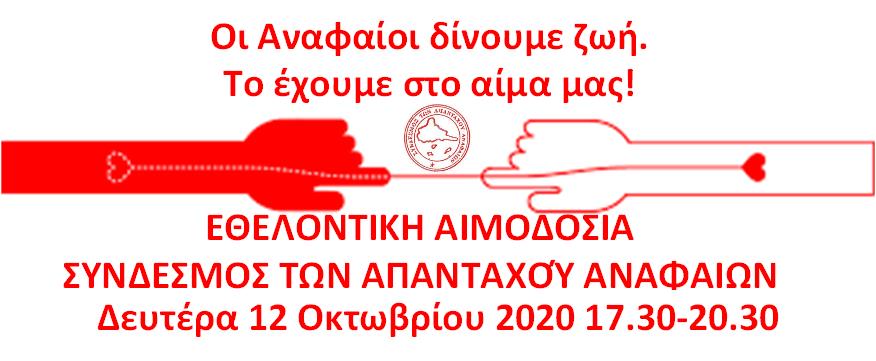 O Σύνδεσμος των Απανταχού Αναφαίων σας καλεί σε εθελοντική αιμοδοσία την Δευτέρα 12 Οκτωβρίου 2020 και ώρες 17.30 έως 20.30.