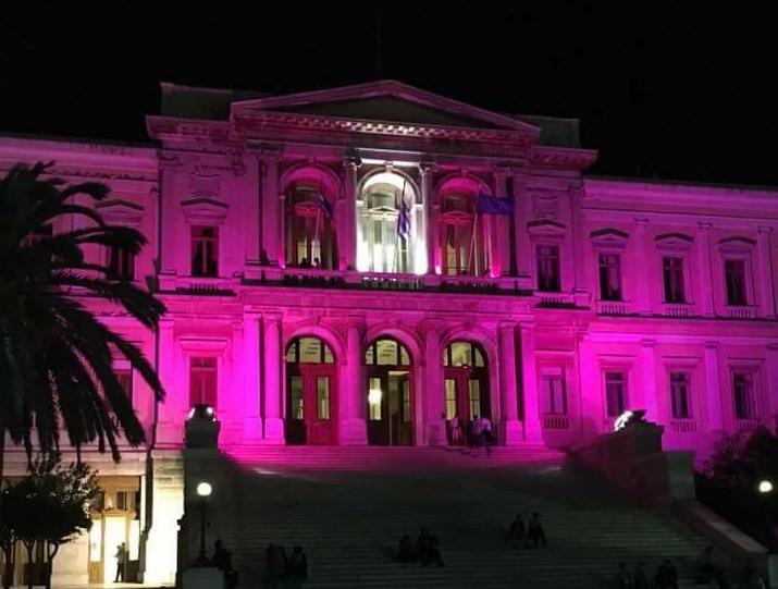Η πρόεδρος και τα μέλη του Συλλόγου, ευχαριστούν το Τμήμα Πολιτισμού του Δήμου Σύρου, που για τέταρτη συνεχόμενη χρονιά, φωταγώγησε το Δημαρχιακό μας Μέγαρο, με το χρώμα που χαρακτηρίζει τον μήνα Οκτώβριο, ως μήνα του Καρκίνου του μαστού που είναι αφιερωμένος στην πρόληψη και ενημέρωση του καρκίνου του μαστού.