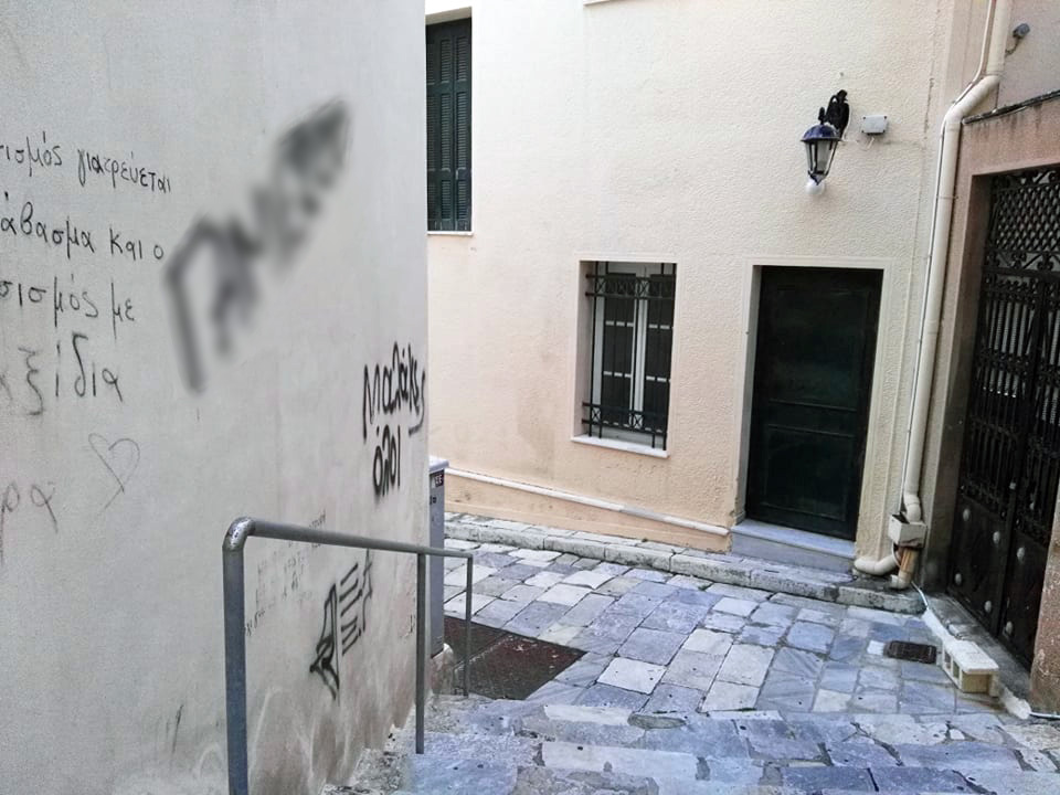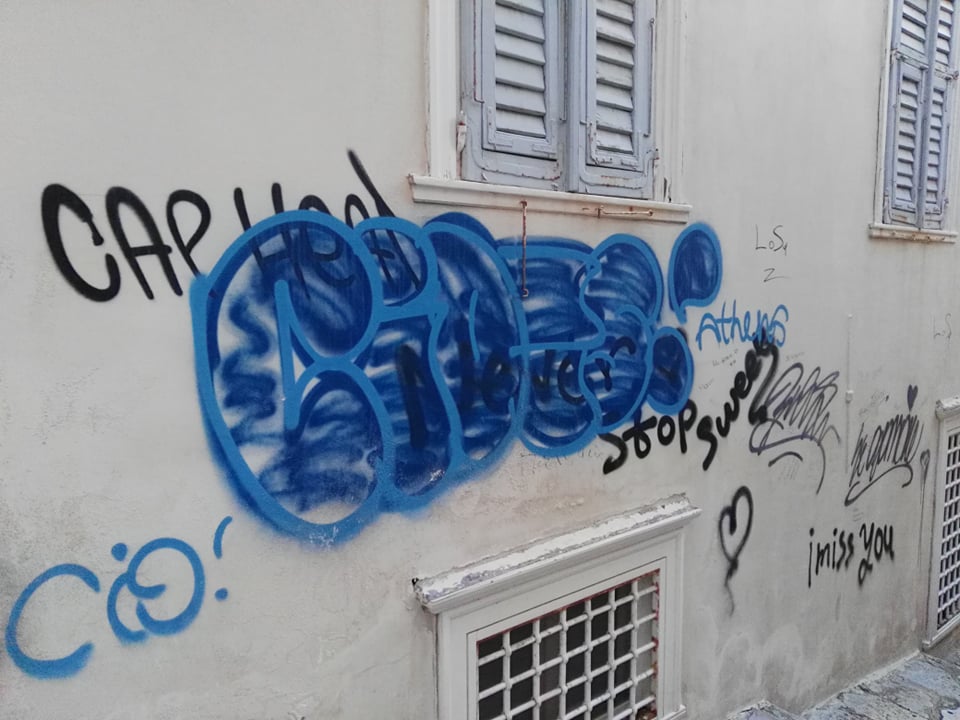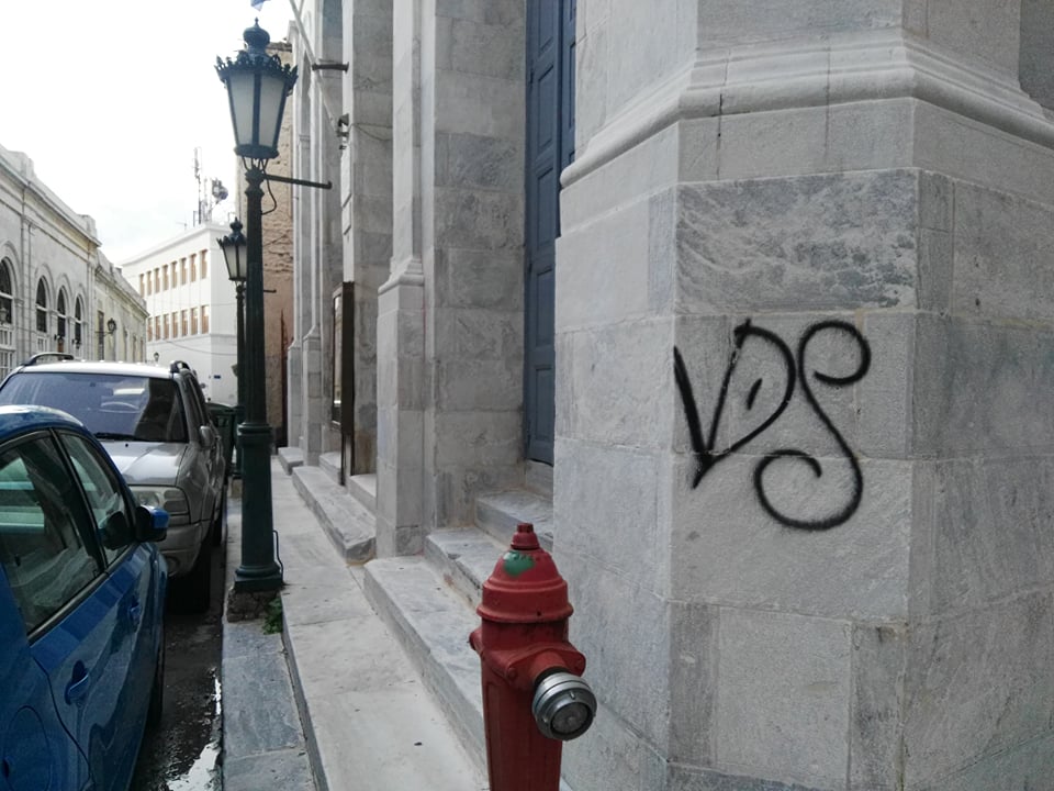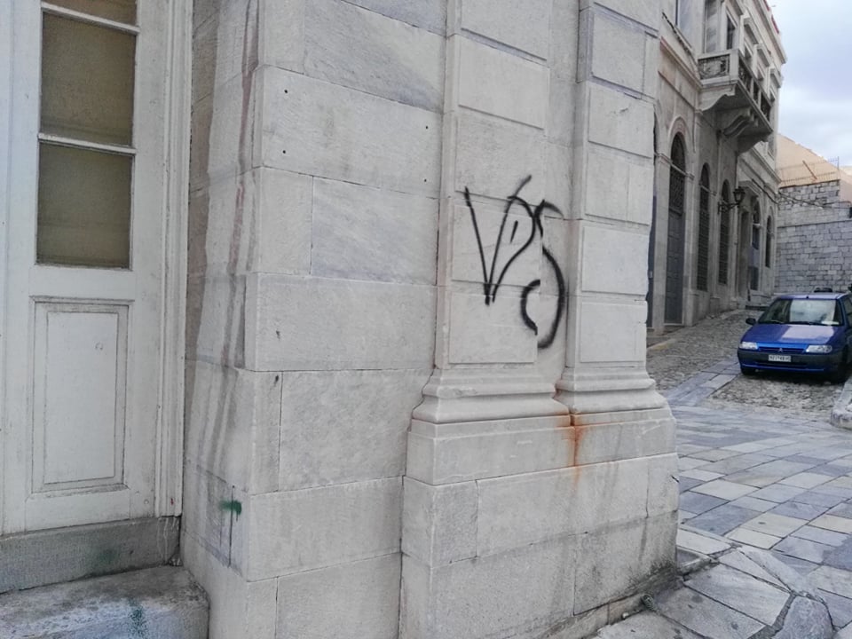 “Φρέσκα” συνθήματα, γκράφιτι αλλά ακόμη και βωμολοχίες διαπιστώνονται στις επιφάνειες κτιρίων της Ερμούπολης, καθώς ασυνείδητοι προέβησαν στην καταστροφή της εικόνας τους, για μία ακόμη φορά, στο ιστορικό κέντρο.