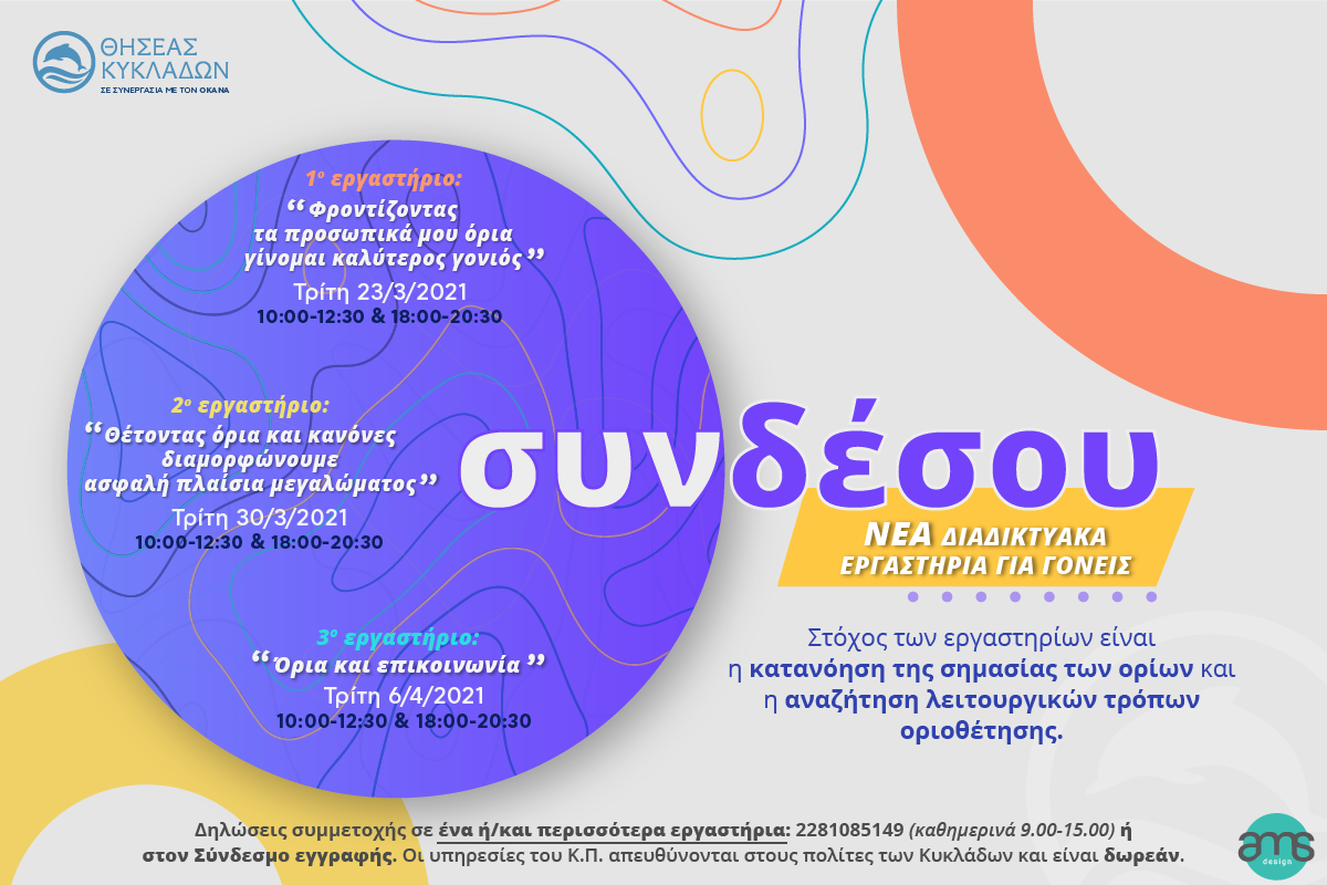 Λόγω της μεγάλης απήχησης που είχαν τα εργαστήρια για γονείς με κεντρικό θέμα τα όρια, το Κέντρο Πρόληψης «ΘΗΣΕΑΣ ΚΥΚΛΑΔΩΝ» διοργανώνει εκ νέου εργαστήρια με το ίδιο θέμα στις 23, 30 Μαρτίου & 6 Απριλίου 2021 και προσκαλεί γονείς από όλα τα νησιά των Κυκλάδων να συμμετέχουν. Επίσης, θα πραγματοποιηθεί εργαστήριο για μαθητές λυκείου με θέμα τα όρια την Κυριακή 21 Μαρτίου 2021.