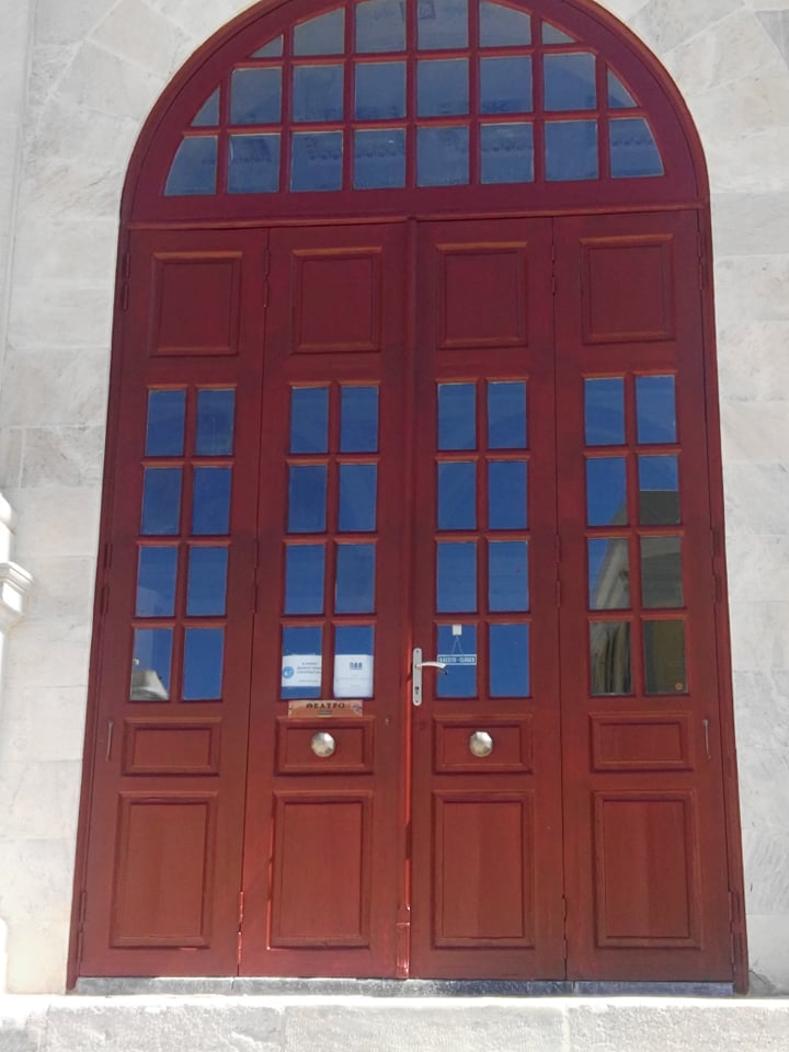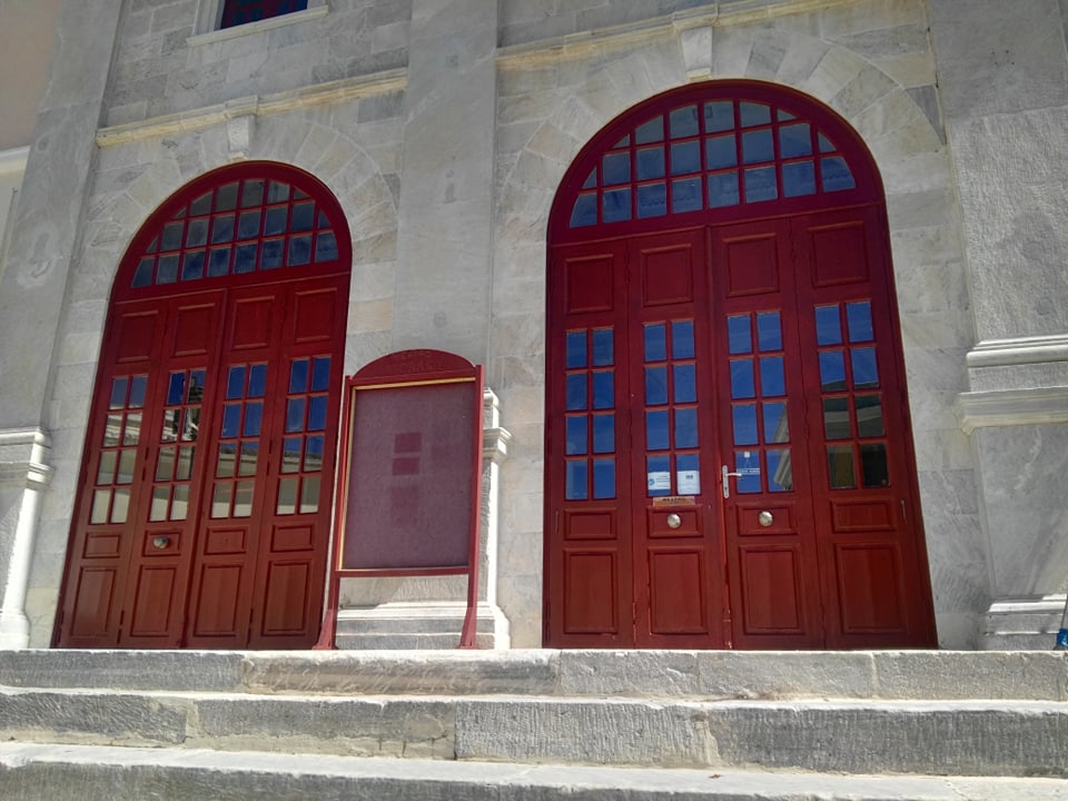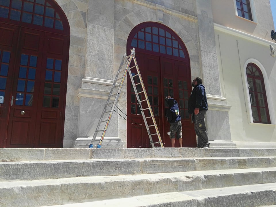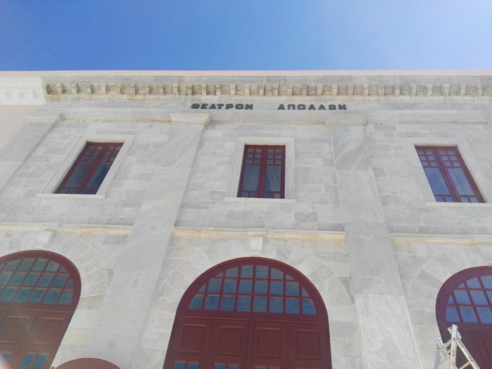 Ολοκληρώνονται οι εργασίες βαψίματος των κουφωμάτων της πρόσοψης του ιστορικού θεάτρου “Απόλλων”, στο πλαίσιο της εργολαβίας που είχε ο Δήμος Σύρου – Ερμούπολης, με σκοπό τις απαιτούμενες συντηρήσεις, προκειμένου η εικόνα του κτιρίου να βελτιωθεί συνολικά.