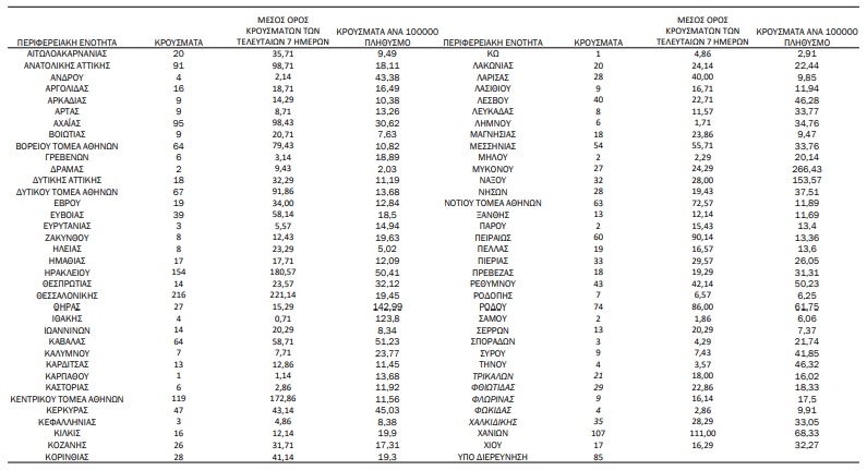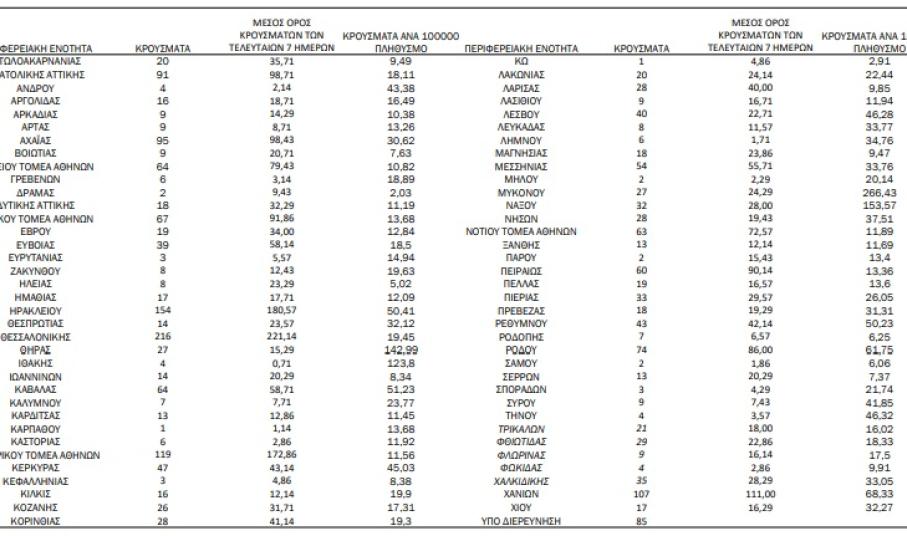 Κατανομή ανακοινωθέντων εγχώριων κρουσμάτων: Από το σύνολο των 2.218 νέων κρουσμάτων του νέου ιού στη χώρα 12 είναι εισαγόμενα εκ των οποίων 7 εντοπίστηκαν κατόπιν ελέγχων στις πύλες εισόδου της χώρας . Η κατανομή των 2.206 νέων εγχώριων κρουσμάτων ανά Περιφερειακή Ενότητα παρουσιάζεται στον κατωτέρω πίνακα.