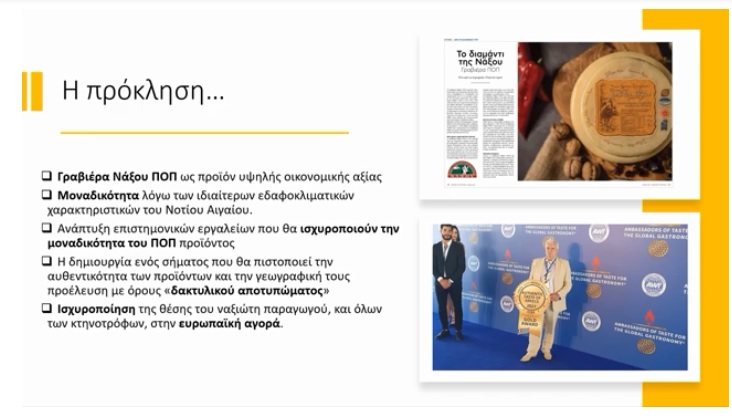 Για την επίτευξη αυτού του στόχου υλοποιεί ένα καινοτόμο ερευνητικό πρόγραμμα με τίτλο «Παρακολούθηση του περιβαλλοντικού αποτυπώματος στο Π.Ο.Π. προϊόν Γραβιέρα Νάξου για την πιστοποίηση της αυθεντικότητας και της γεωγραφικής προέλευσης» στα πλαίσια της Δράσης «ΕΡΕΥΝΩ – ΔΗΜΙΟΥΡΓΩ – ΚΑΙΝΟΤΟΜΩ Β’ ΚΥΚΛΟΣ» που εντάσσεται στο Επιχειρησιακό Πρόγραμμα «ΑΝΤΑΓΩΝΙΣΤΙΚΟΤΗΤΑ, ΕΠΙΧΕΙΡΗΜΑΤΙΚΟΤΗΤΑ & ΚΑΙΝΟΤΟΜΙΑ» (ΕΠΑνΕΚ) 2014-2020.