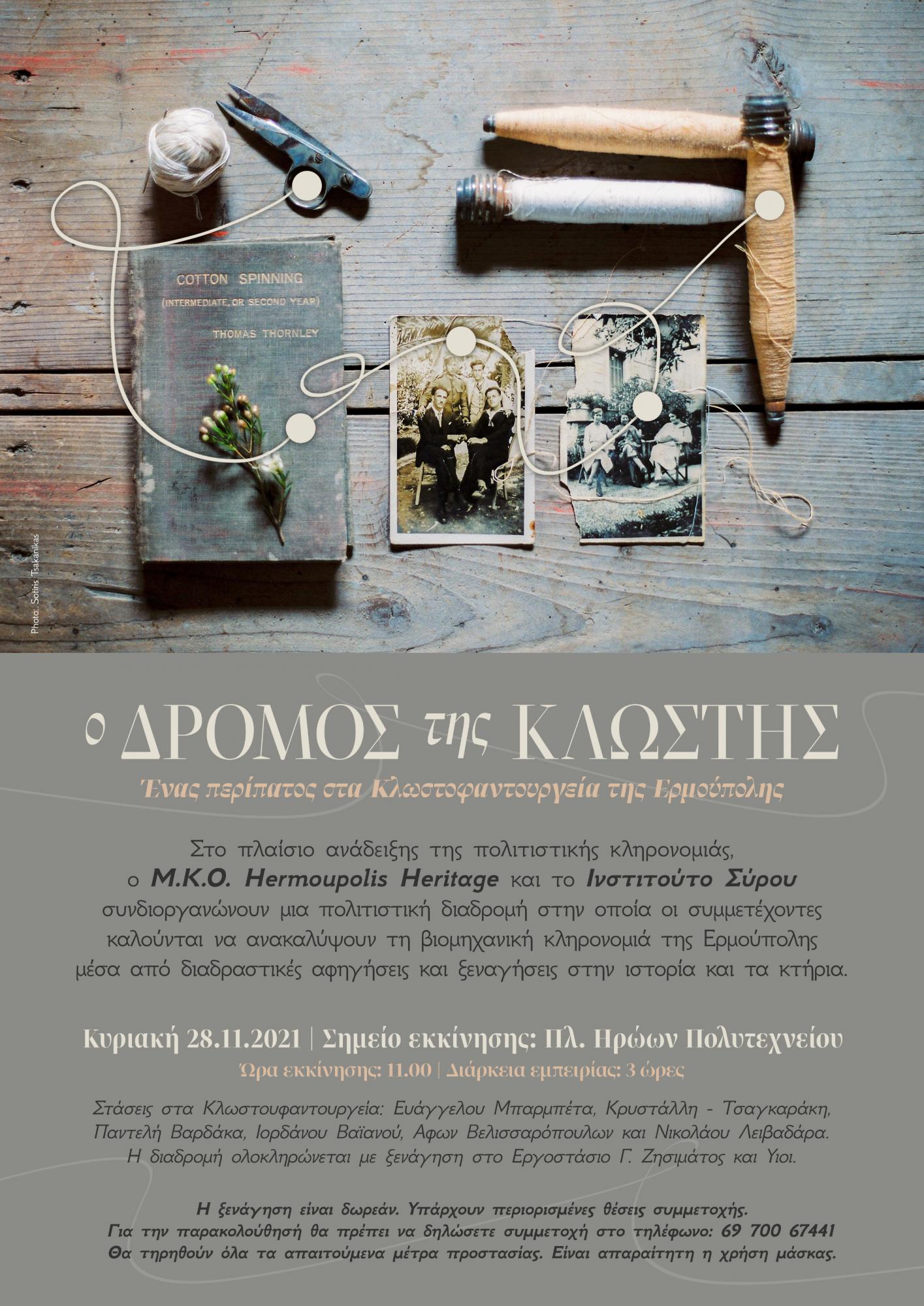 Στο πλαίσιο ανάδειξης της πολιτιστικής κληρονομιάς, ο Μ.Κ.Ο Hermoupolis Heritage και το Ινστιτούτο Σύρου συνδιοργανώνουν μια πολιτιστική διαδρομή στην οποία οι συμμετέχοντες καλούνται να ανακαλύψουν τη βιομηχανική κληρονομιά της Ερμούπολης μέσα από διαδραστικές αφηγήσεις και ξεναγήσεις στην ιστορία και στα κτήρια.
