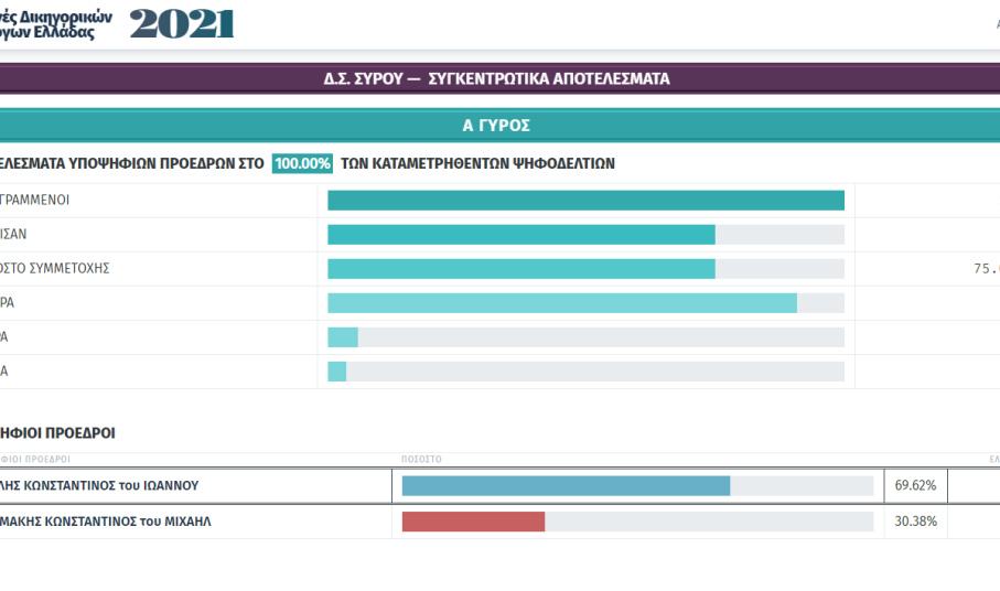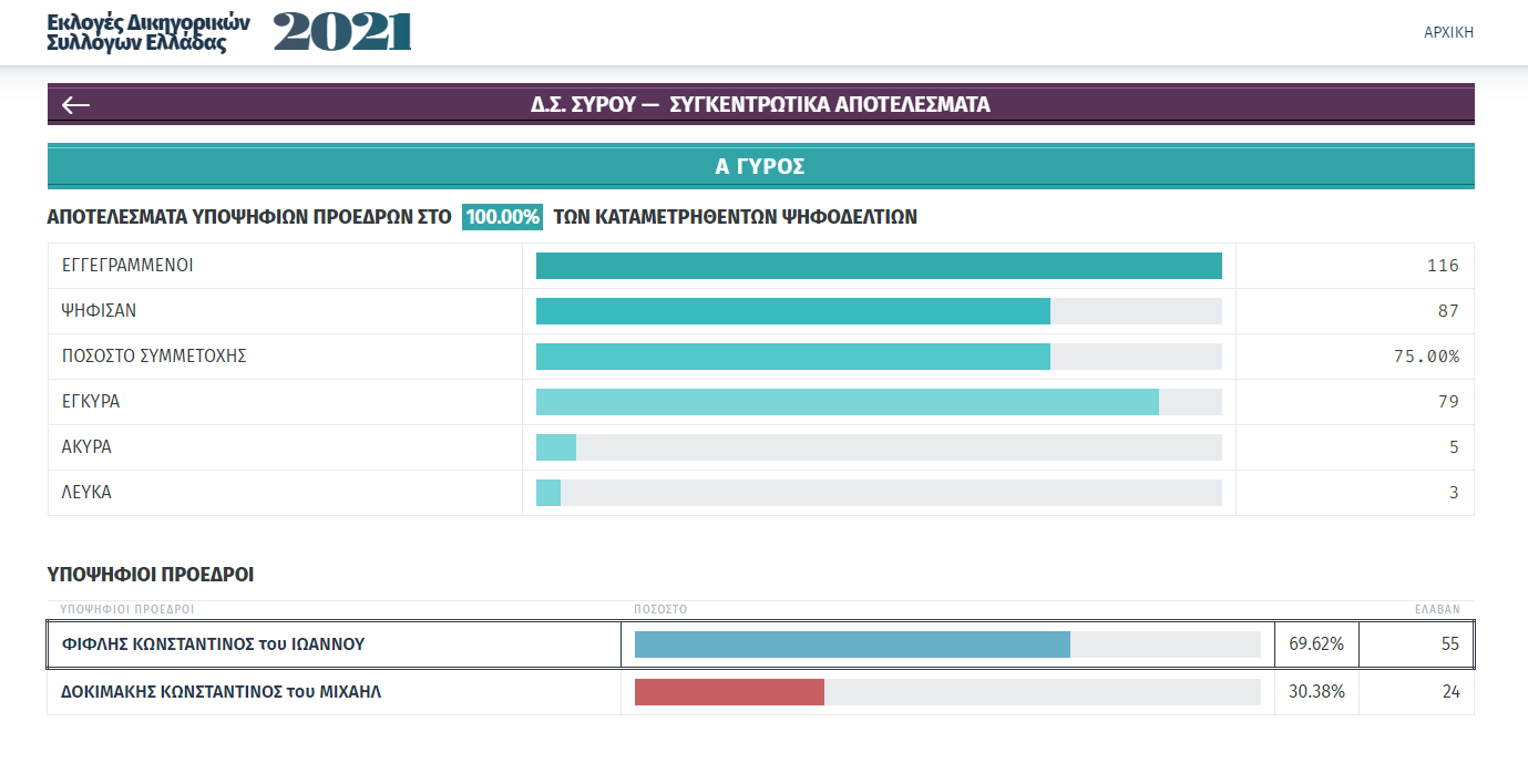 Μετά την ολοκλήρωση της εκλογικής διαδικασίας για την ανάδειξη Προέδρου και νέου Διοικητικού Συμβουλίου του Δικηγορικού Συλλόγου Σύρου που διενεργήθηκε το διήμερο 27 και 28 Νοεμβρίου 2021, και της καταμέτρησης των ψήφων, σας γνωστοποιούμε τα αποτελέσματα, ως κάτωθι: