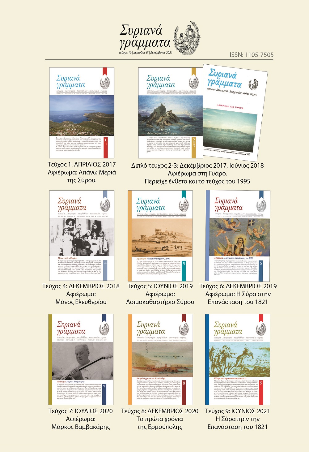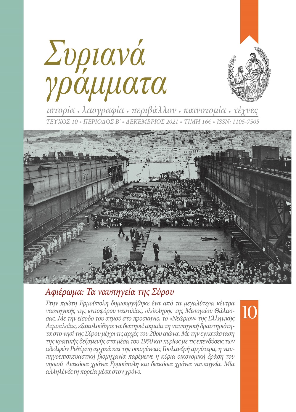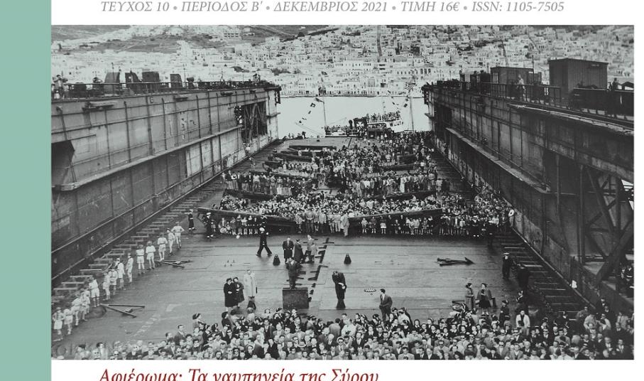 Στο σημείωμα του εξωφύλλου για τον νέο τόμο, το περιεχόμενο του οποίου εισάγει τον αναγνώστη στην ουσία του ενδιαφέροντος αφιερώματος, σημειώνονται τα εξής: “Στην πρώτη Ερμούπολη δημιουργήθηκε ένα από τα μεγαλύτερα κέντρα ναυπηγικής της ιστιοφόρου ναυτιλίας, ολόκληρης της Μεσογείου Θάλασσας. Με την είσοδο του ατμού στο προσκήνιο, το “Νεώριον” της Ελληνικής Ατμοπλοΐας, εξακολούθησε να διατηρεί ακμαία τη ναυπηγική δραστηριότητα στο νησί της Σύρου μέχρι τις αρχές του 20ου αιώνα. Με την εγκατάσταση της κρατικής δεξαμενής στα μέσα του 1950 και κυρίως με τις επενδύσεις των αδελφών Ρεθύμνη αρχικά και της οικογένειας Γουλανδρή αργότερα, η ναυπηγοεπισκευαστική βιομηχανία παρέμεινε η κύρια οικονομική δράση του νησιού. Διακόσια χρόνια Ερμούπολη, διακόσια χρόνια ναυπηγεία. Μία αλληλένδετη πορεία μέσα στον χρόνο.”.