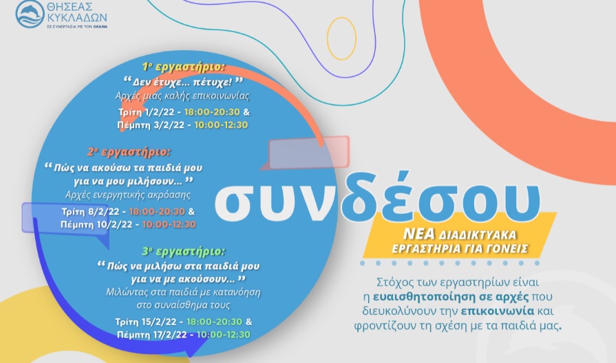 Το Κέντρο Πρόληψης «ΘΗΣΕΑΣ ΚΥΚΛΑΔΩΝ» διοργανώνει νέα διαδικτυακά εργαστήρια για γονείς από όλα τα νησιά των Κυκλάδων με κεντρικό θέμα την επικοινωνία.