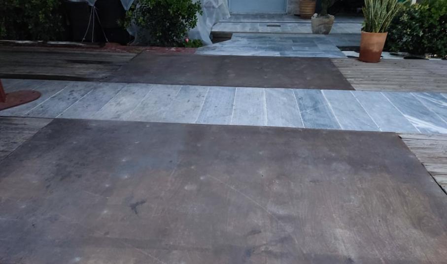 Επιπλέον, ορισμένα τμήματα γύρω από τις πακτωμένες ομπρέλες έχουν υποχωρήσει παρομοίως, ενώ ακόμη, μέρη του δαπέδου στις “συνδέσεις” με το μαρμάρινο μέρος της πλατείας, παρουσίασαν κενά.