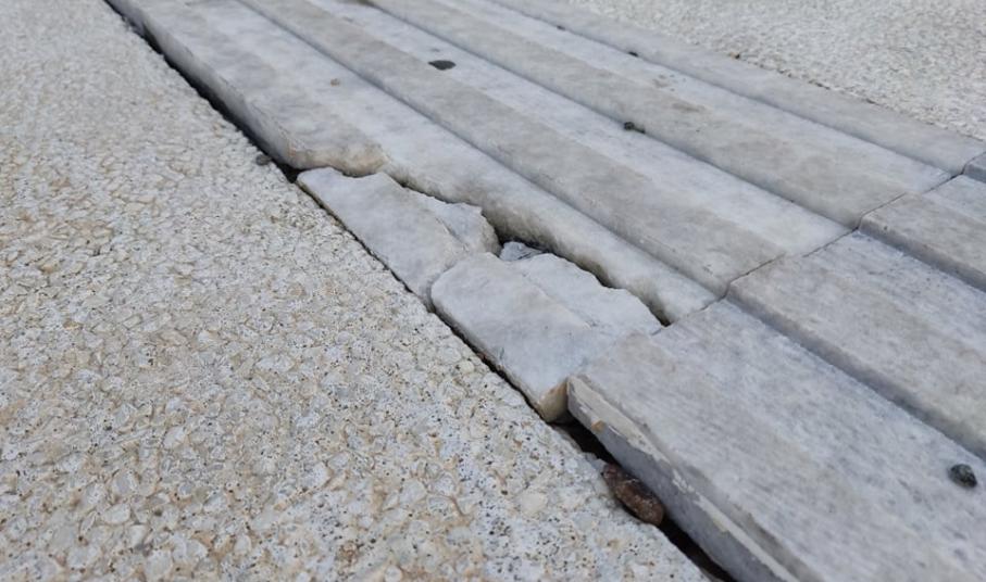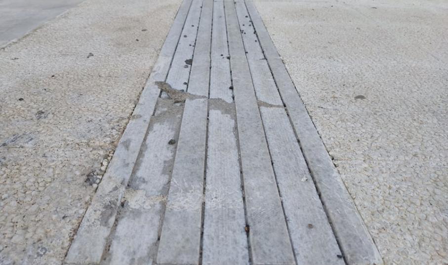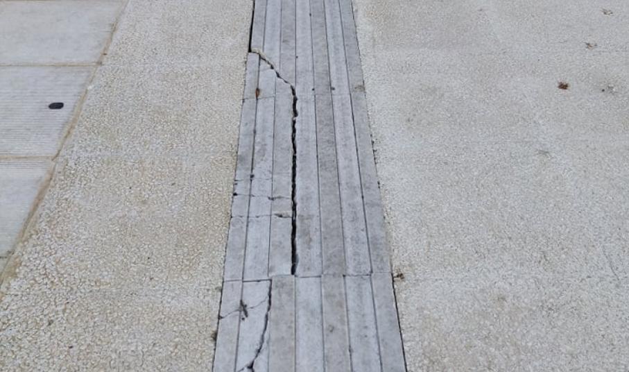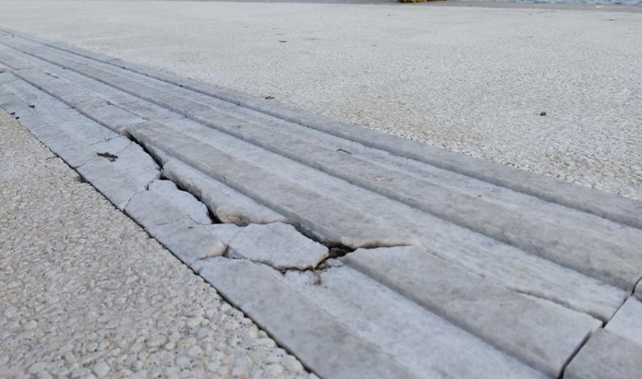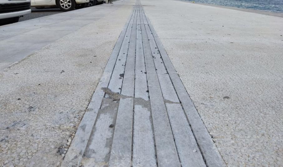 Οι εικόνες της εφημερίδας προδίδουν την κάκιστη κατάσταση των ειδικών “δαπέδων”, σε ένα νησί που έχει βραβευθεί για την προσβασιμότητα.