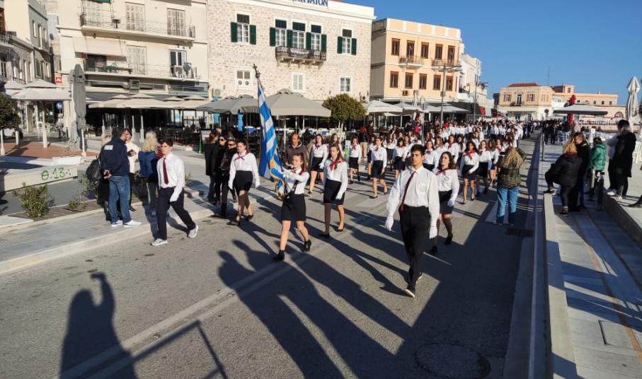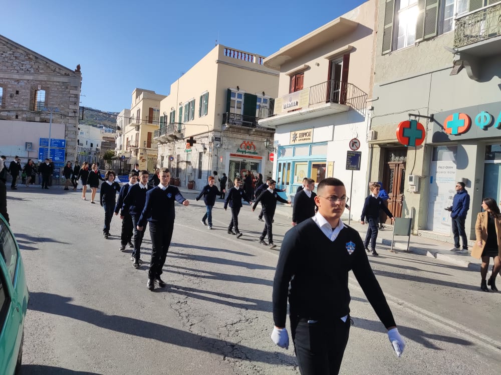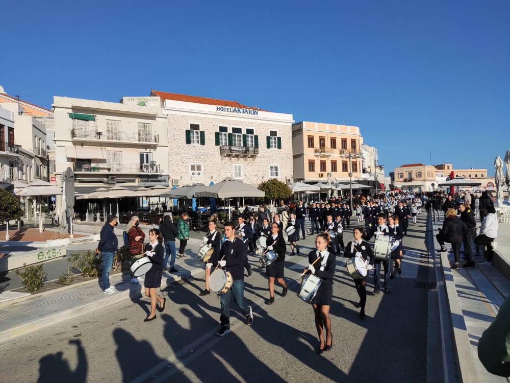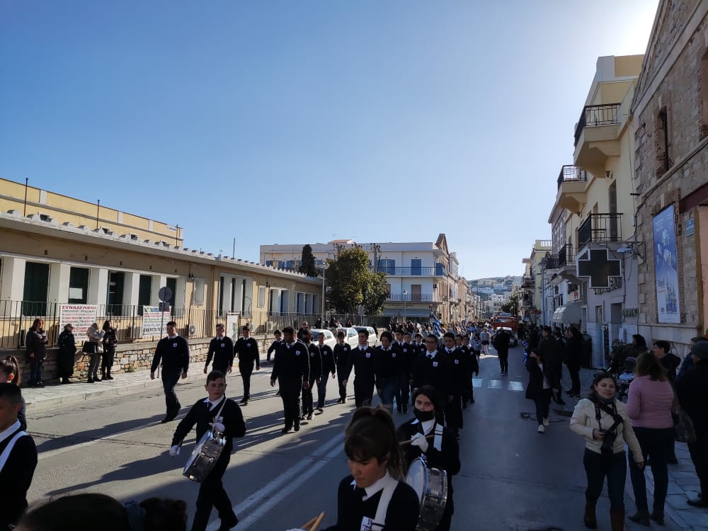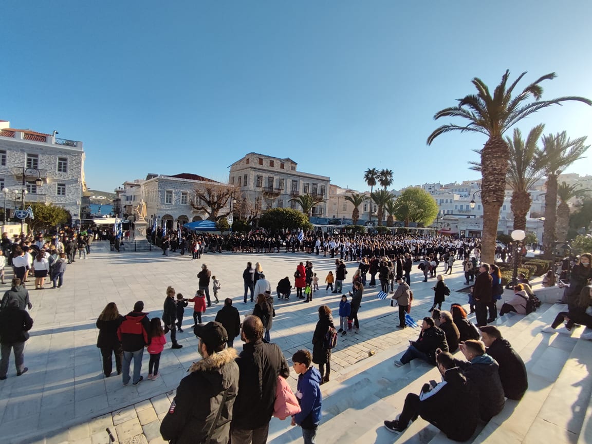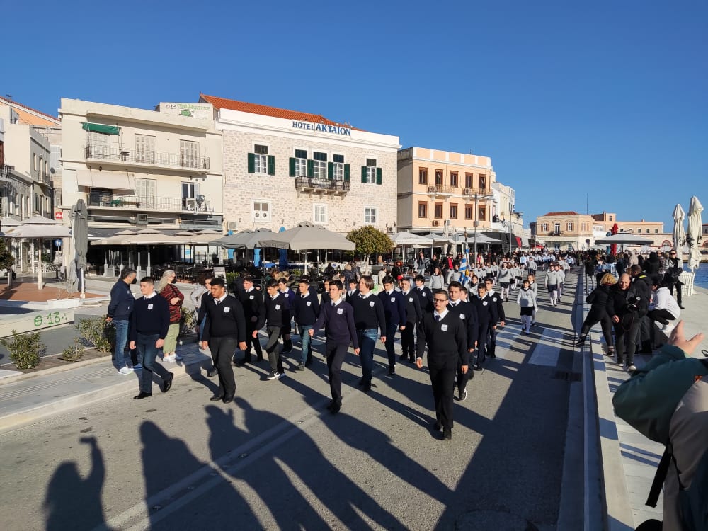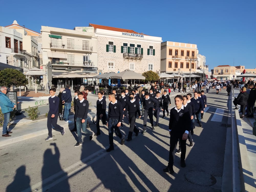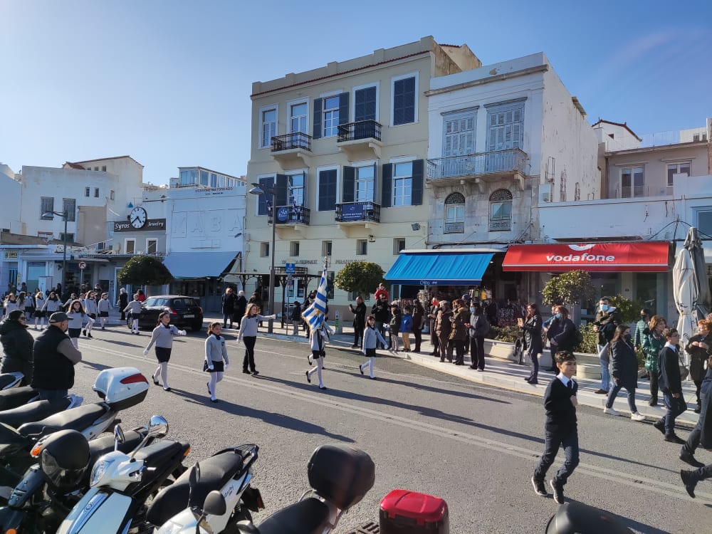 Μετά από δύο έτη πανδημίας, οι μαθητές πραγματοποιούν κανονικά τη στεφάνωση, τηρώντας τα μέτρα προστασίας ενάντια στον κορωνοϊό. Σύμφωνα με το πρόγραμμα της στεφάνωσης οι μαθητές ξεκίνησαν από την πλατεία Ηρώων και σταδιακά φθάνουν στο κέντρο της Ερμούπολης.