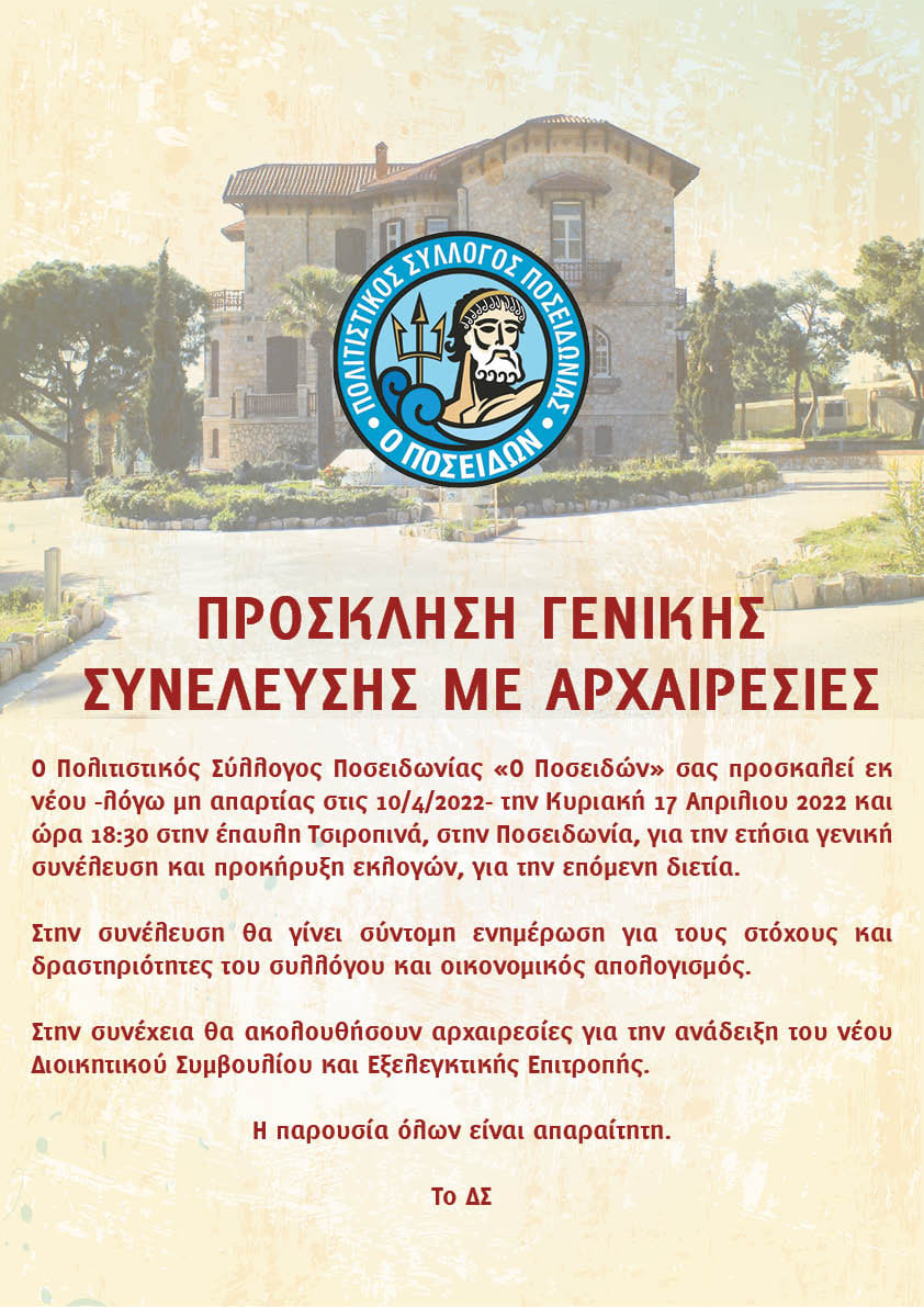Την Τετάρτη 20 Απριλίου 2022 συγκροτήθηκε σε σώμα το νέο Διοικητικό Συμβούλιο του Πολιτιστικού Συλλόγου «Ποσειδών» το οποίο προέκυψε μετά τις εκλογές της 17ης Απριλίου 2022. Τα εκλεγμένα μέλη του Συλλόγου μετά από μυστική ψηφοφορία, συγκροτήθηκαν σε σώμα ως εξής: