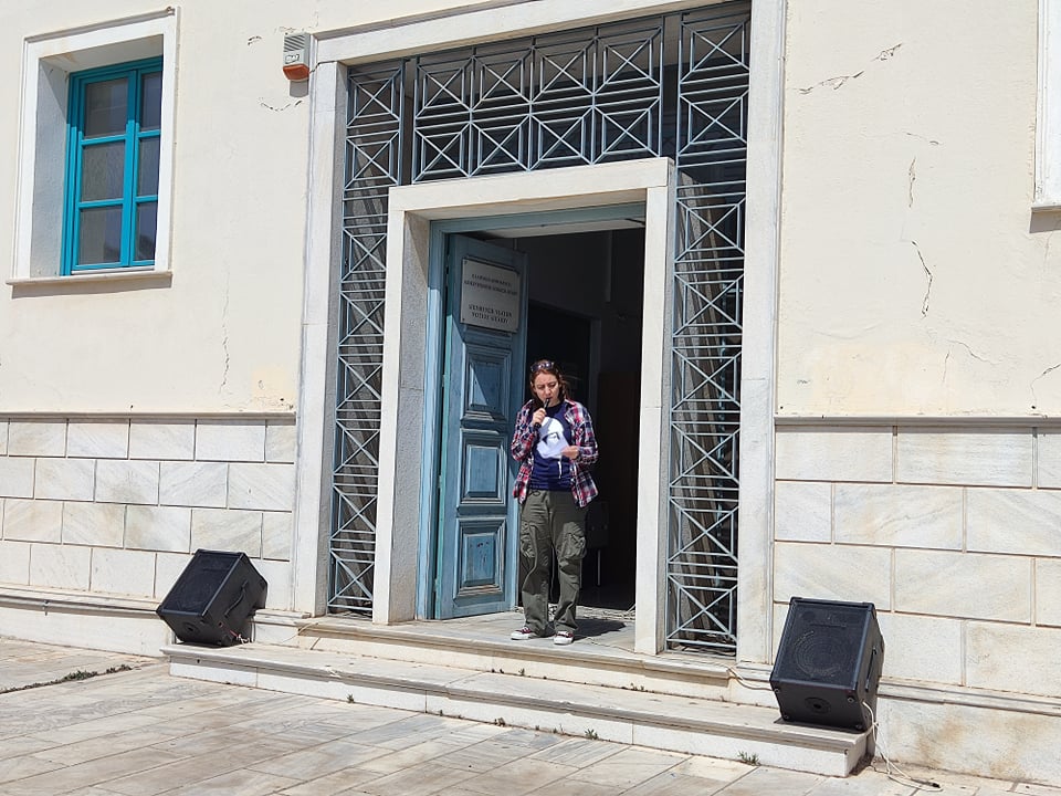 Ειδικότερα, στον χαιρετισμό της, εκπρόσωπος του Σωματείου Ιδιωτικών Υπαλλήλων Κυκλάδων κατήγγειλε αρχικά “το όργιο καταστολής ενάντια στους απεργούς λιμενεργάτες της COSCO”, διαβάζοντας το σχετικό ψήφισμα συμπαράστασης που εξέδωσε το Σωματείο.