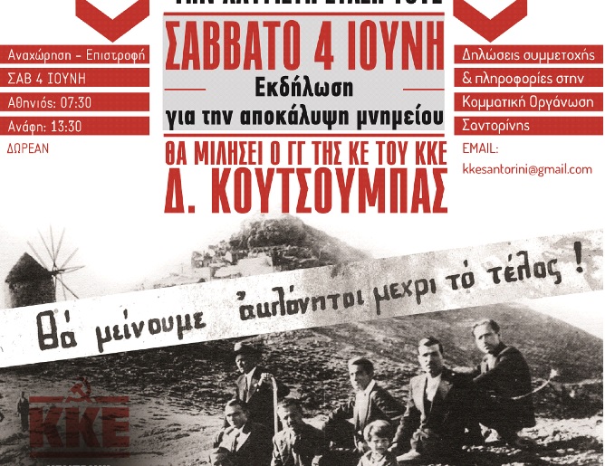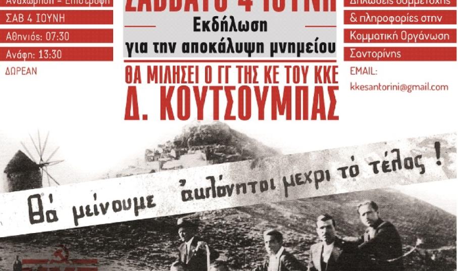 Η Κεντρική Επιτροπή του Κομμουνιστικού Κόμματος Ελλάδας, στο πλαίσιο των εκδηλώσεων τιμής και μνήμης που πραγματοποιεί σε όλη την Ελλάδα, διοργανώνει στο νησί της Ανάφης, εκδήλωση για τα αποκαλυπτήρια μνημείου αφιερωμένου στους πολιτικούς εξόριστους των περιόδων 1924- 1943 και 1946-1948 που εκτοπίστηκαν στο νησί, το Σάββατο 4 Ιουνίου 2022, ώρα 10.00 πμ.