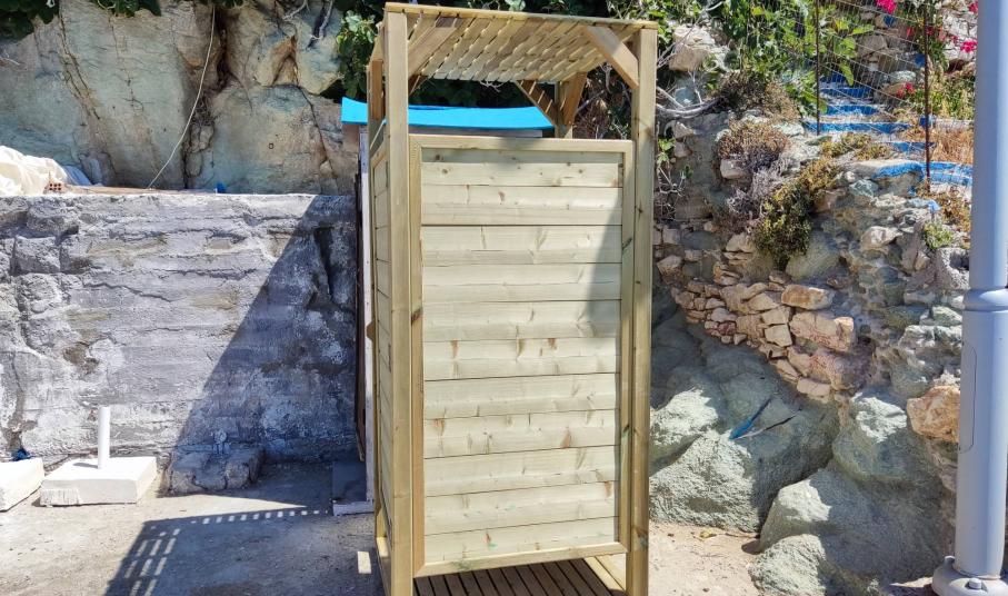 Ολοκληρώθηκε προ ημερών η επίστρωση της μεγάλης πλατφόρμας και τοποθετήθηκαν ομπρέλες και νέα καμπίνα