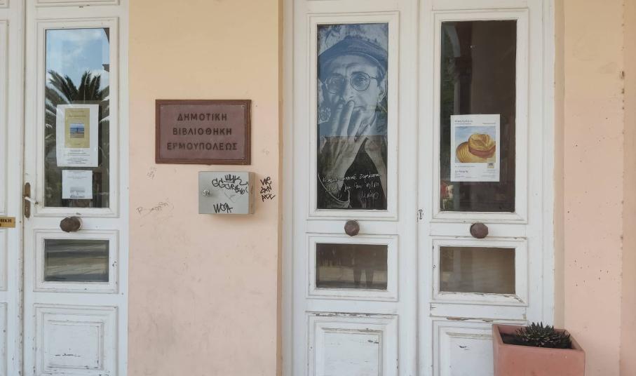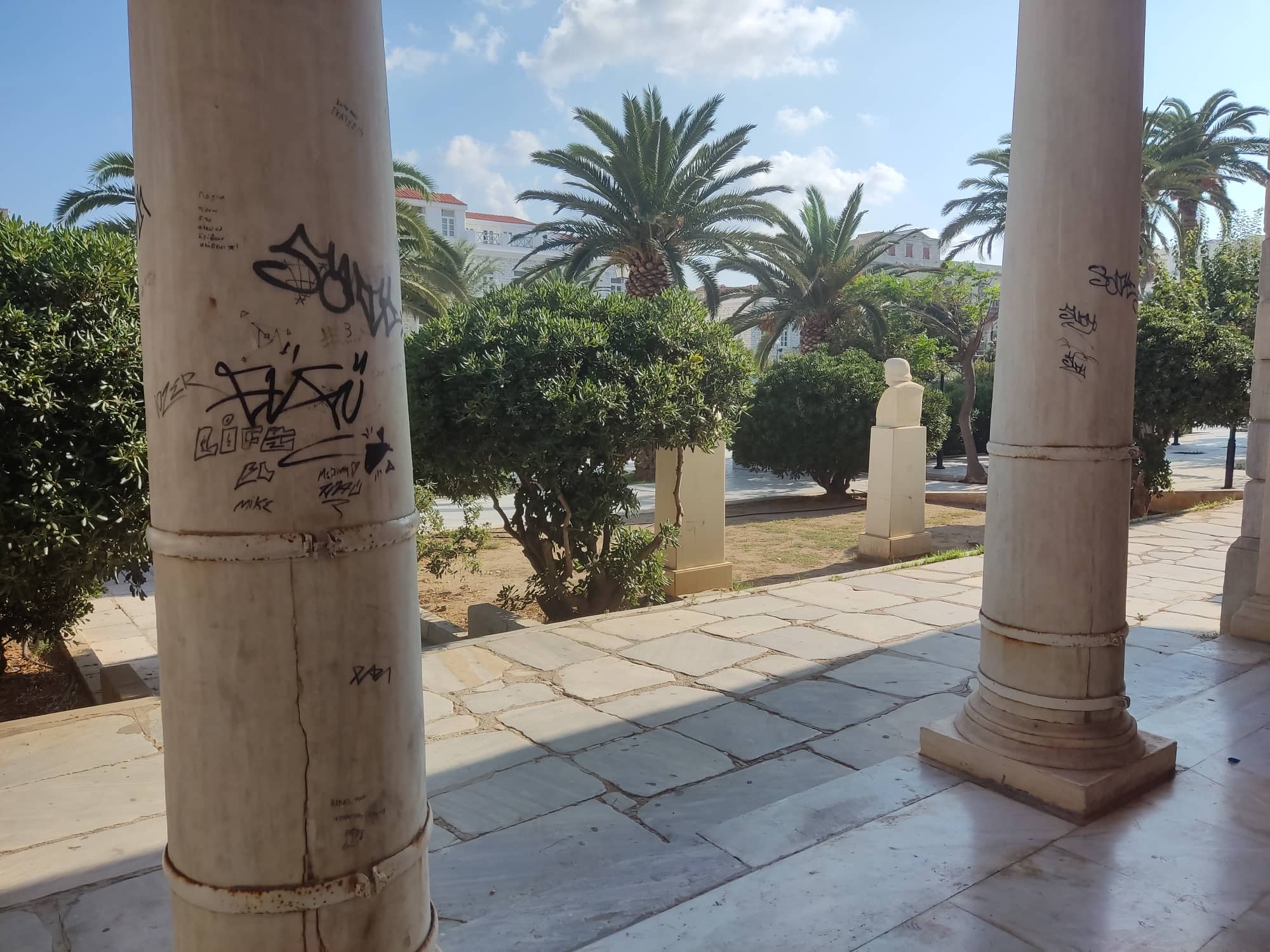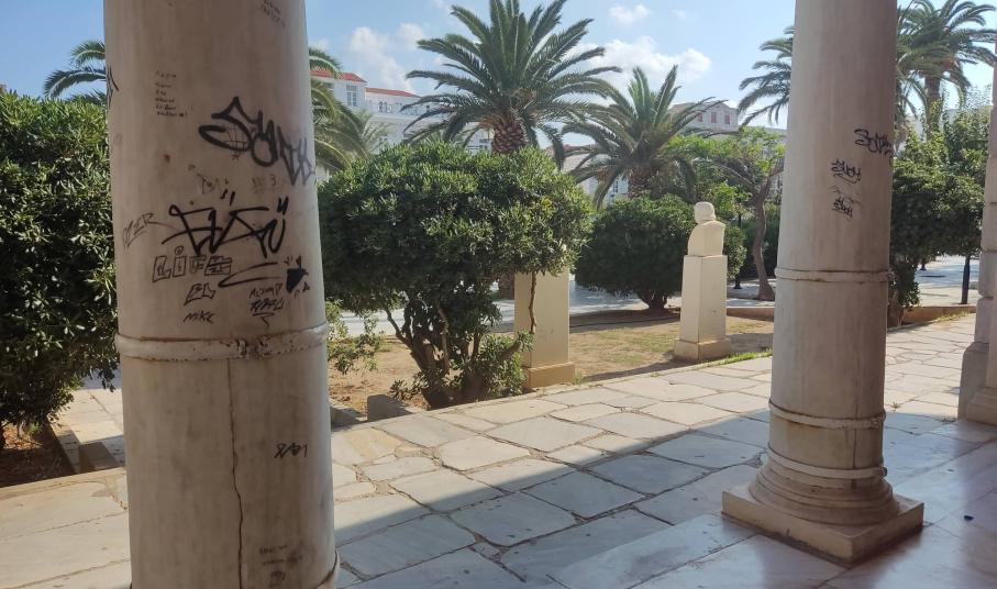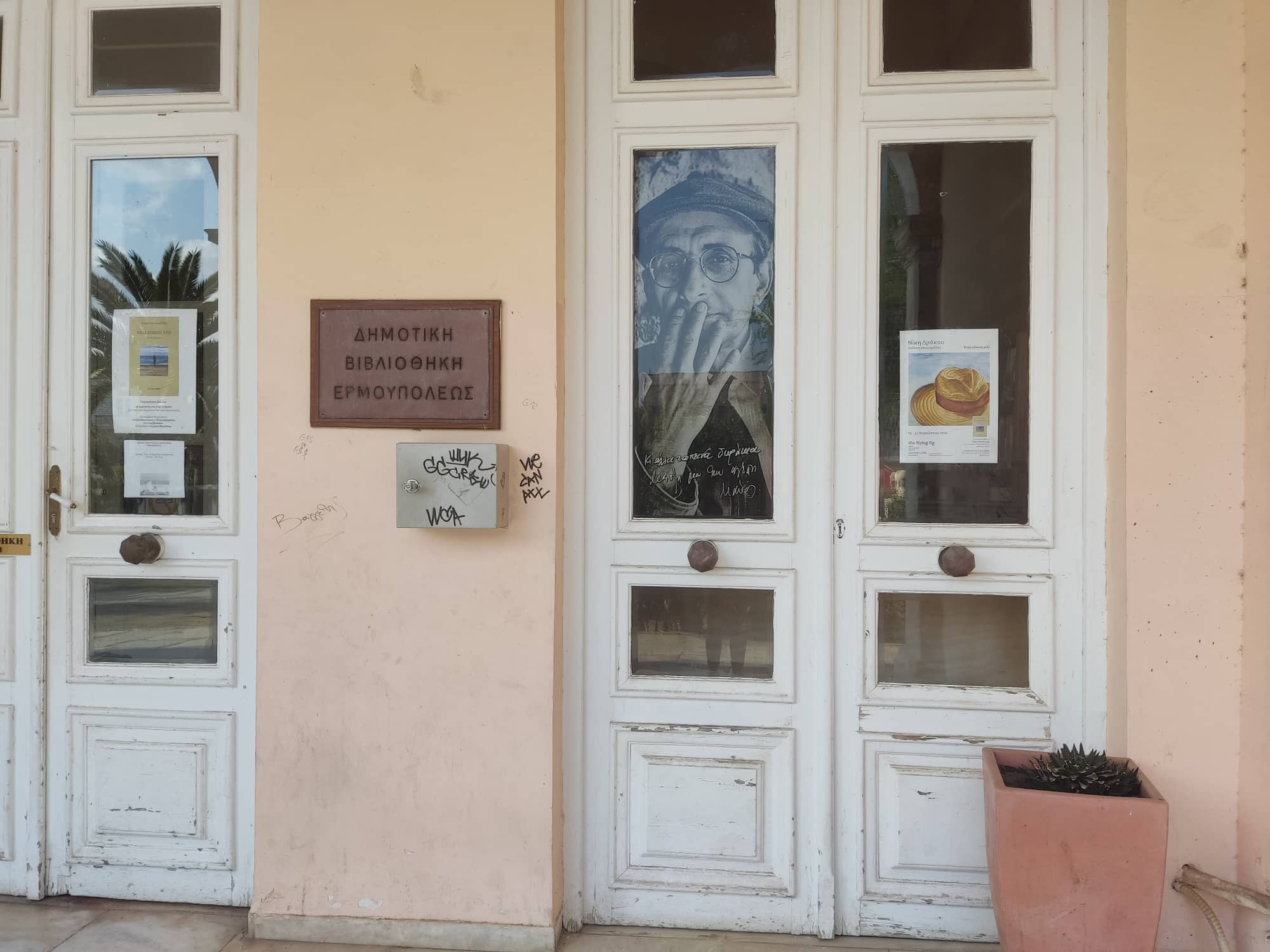 Ιδιαίτερα υποβαθμισμένη δείχνει η πρόσοψη του κτιρίου που στεγάζεται η Δημοτική Βιβλιοθήκη Ερμούπολης, καθώς νεαροί έχουν λερώσει τις επιφάνειες των εξωτερικών τοίχων με συνθήματα και γκράφιτι.