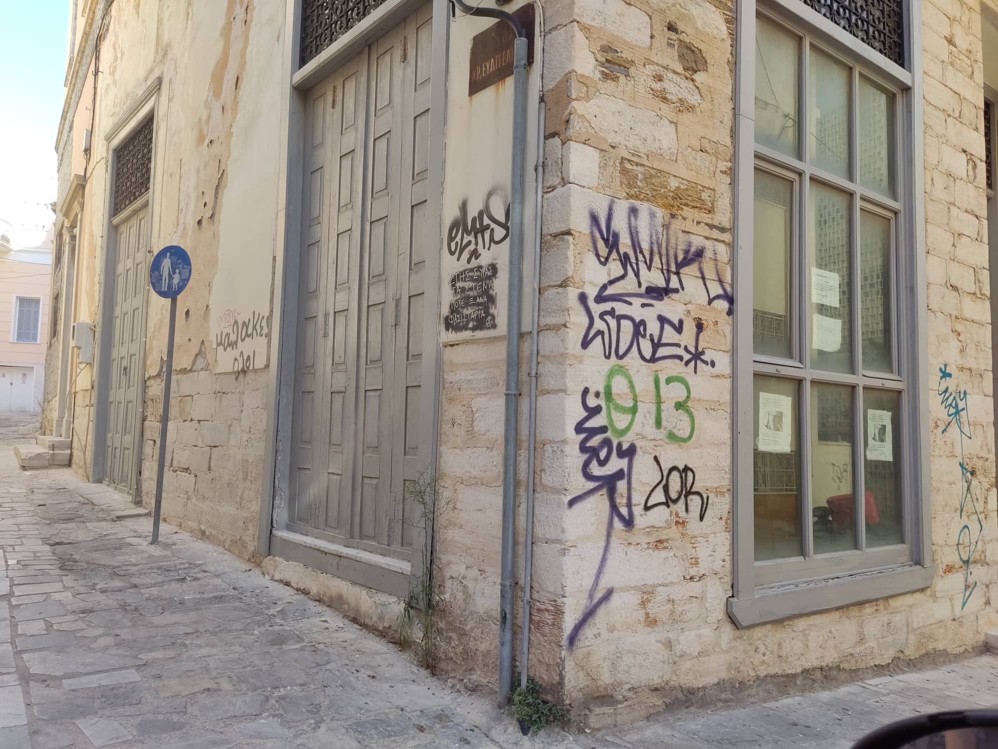 Πρόκειται για ενέργειες που ενοχλούν ιδιαιτέρως, καθώς υποβαθμίζουν ακόμη περισσότερο τον ήδη “ταλαιπωρημένο” κτιριακό πλούτο της Ερμούπολης. Οι υπεύθυνοι για τα γκράφιτι και τα συνθήματα, χρήσιμο θα είναι να αποφασίσουν να βάλουν τέλος σε τέτοιες συμπεριφορές.