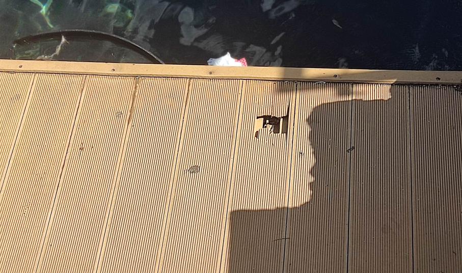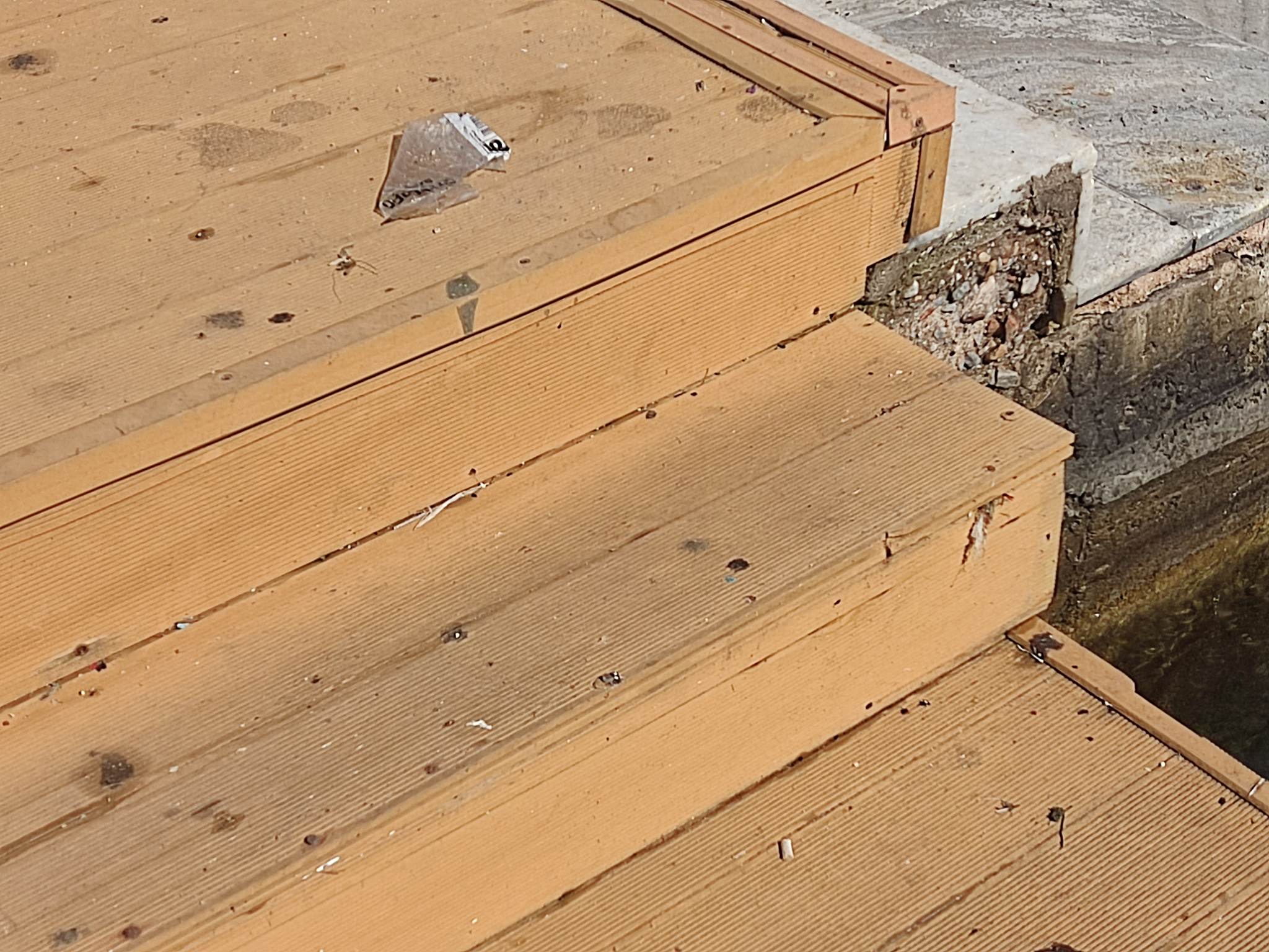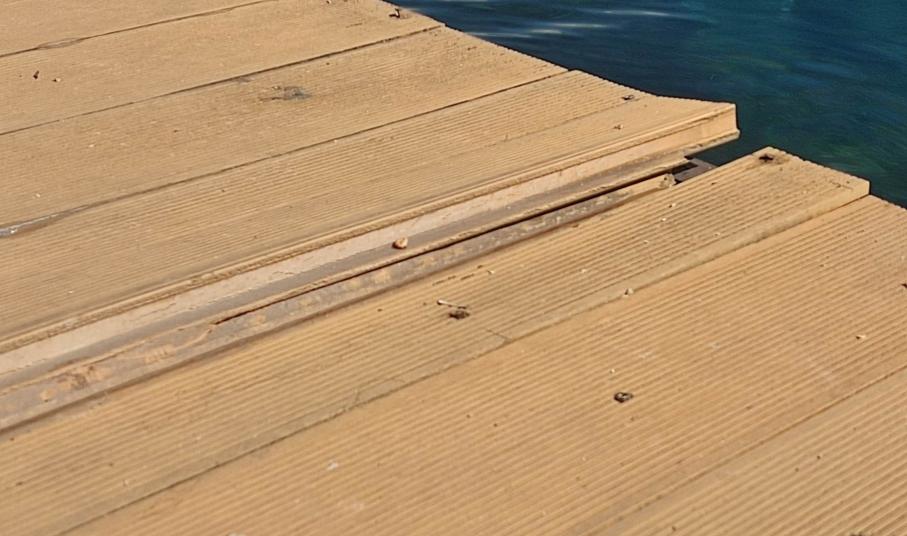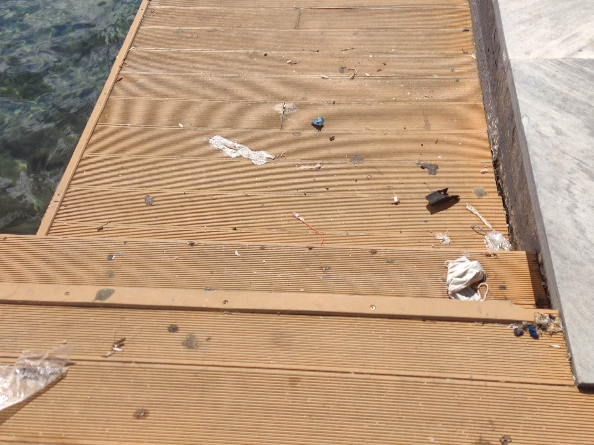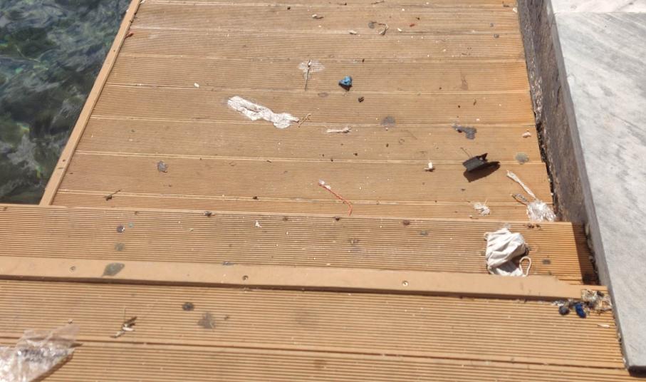 Συγκεκριμένα, το ξύλινο ντεκ έχει σπάσει σε αρκετά σημεία του, έχει τρύπα σε ένα κομμάτι του, ενώ σε αρκετά τμήματά του, οι ξύλινες πλάκες έχουν αποκολληθεί από τη βάση τους. Αποτέλεσμα όλων των ανωτέρω είναι οι λουόμενοι να κινδυνεύουν να τραυματισθούν, καθώς σε πολλά σημεία της, η πλατφόρμα δείχνει να έχει φθαρεί.