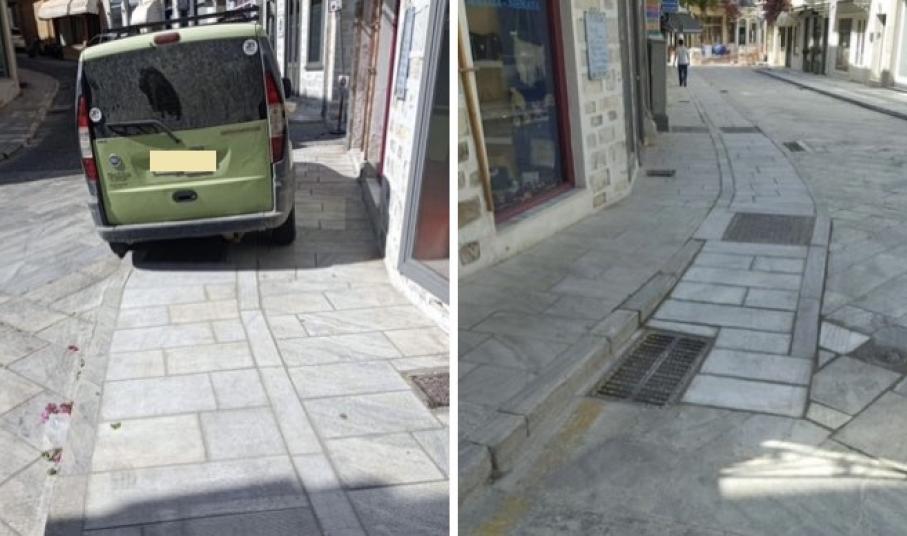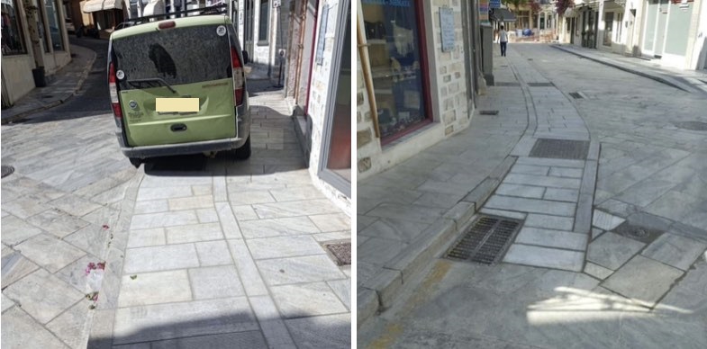 Ειδικότερα, στο πλαίσιο του έργου του Open Mall στις εμπορικές οδούς της πόλης κι εν προκειμένω στην οδό Σταματίου Πρωίου, η μελέτη περιλάμβανε την επέκταση των πεζοδρομίων για την τοποθέτηση οδηγών όδευσης για συμπολίτες μας με προβλήματα όρασης καθώς και τη δημιουργία ραμπών για τη μετακίνηση ατόμων με κινητικά προβλήματα και τη διέλευση αναπηρικών αμαξιδίων. Όπως διαπιστώνεται για μία ακόμη φορά, ασυνείδητοι στάθμευσαν επί των ειδικών πλακιδίων και μαρμάρων με τους οδηγούς όδευσης και τις ράμπες, αδιαφορώντας πλήρως για το αν θα προκληθούν ακόμη και φθορές σε αυτά τα τμήματα, πριν ακόμη “ανοίξει” η Σταματίου Πρωίου.