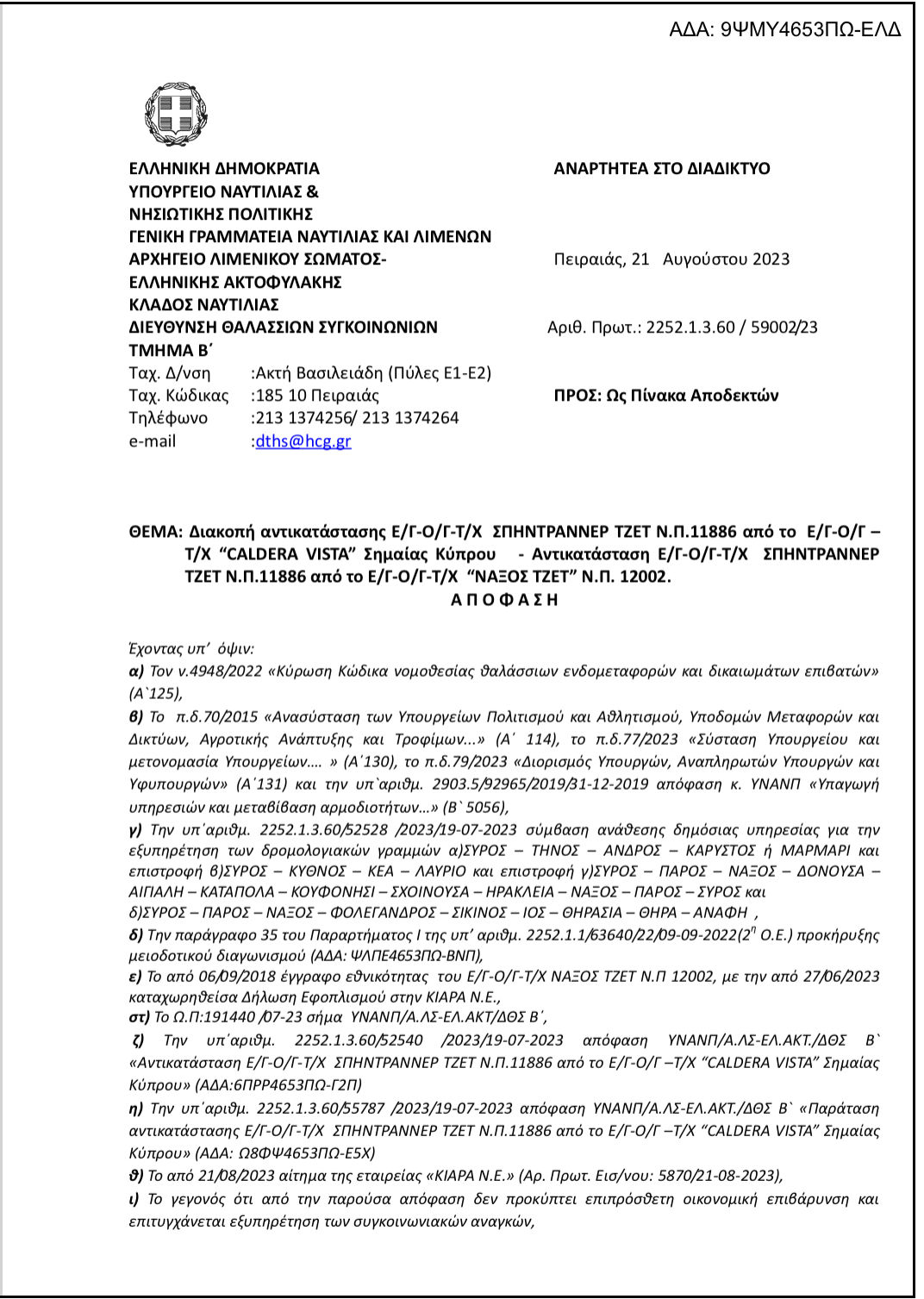 Απο σήμερα,22/8/2023, το caldera vista, θα αντικατασταθεί απο το Naxos jet.