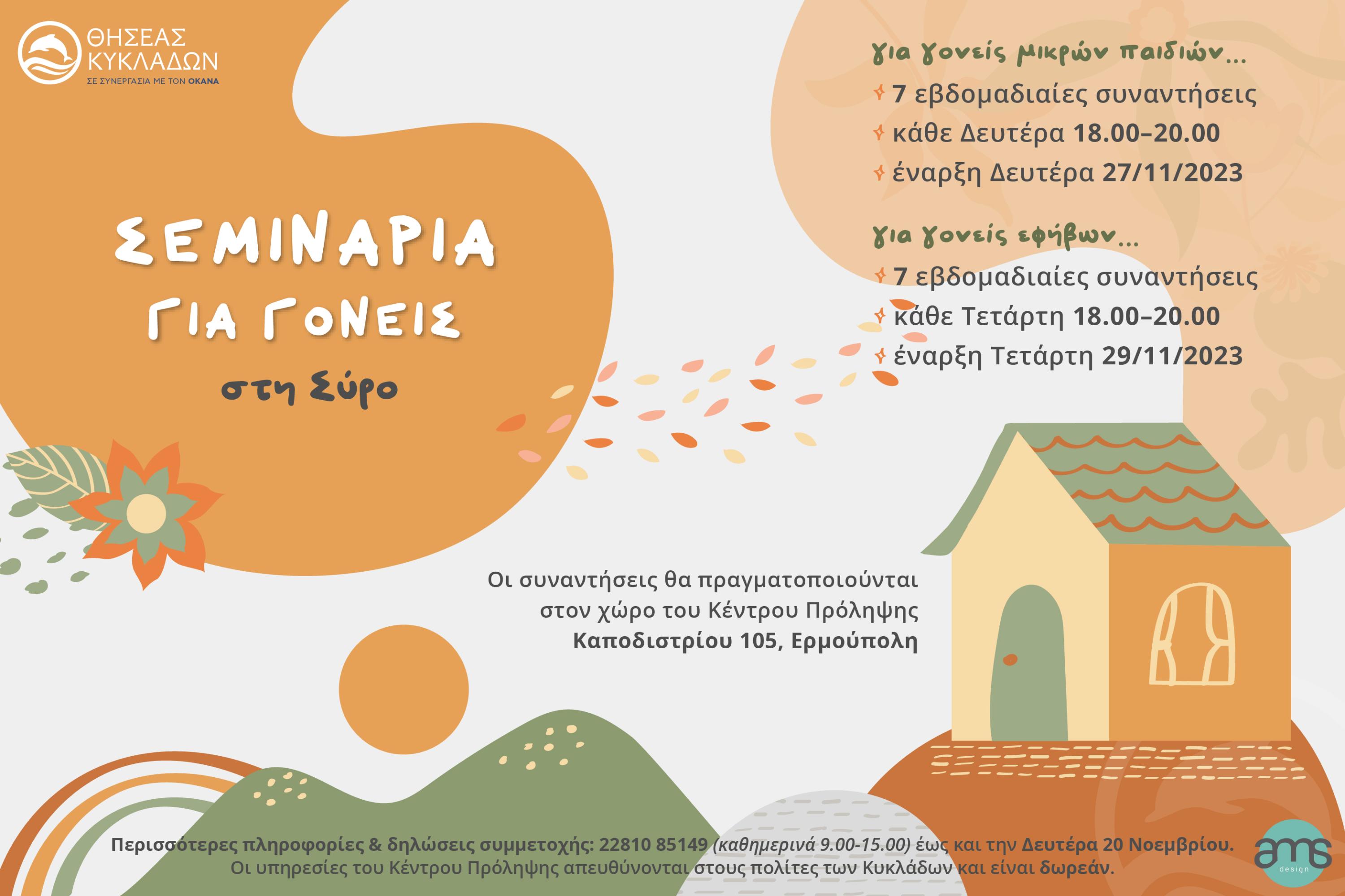 Το Κέντρο Πρόληψης «ΘΗΣΕΑΣ ΚΥΚΛΑΔΩΝ» πρόκειται να υλοποιήσει σεμινάρια για γονείς στη Σύρο με στόχο την υποστήριξη τους στον ιδιαίτερα απαιτητικό και συνάμα ενδιαφέροντα ρόλο τους, όπως αυτός διαμορφώνεται στη σημερινή πραγματικότητα.