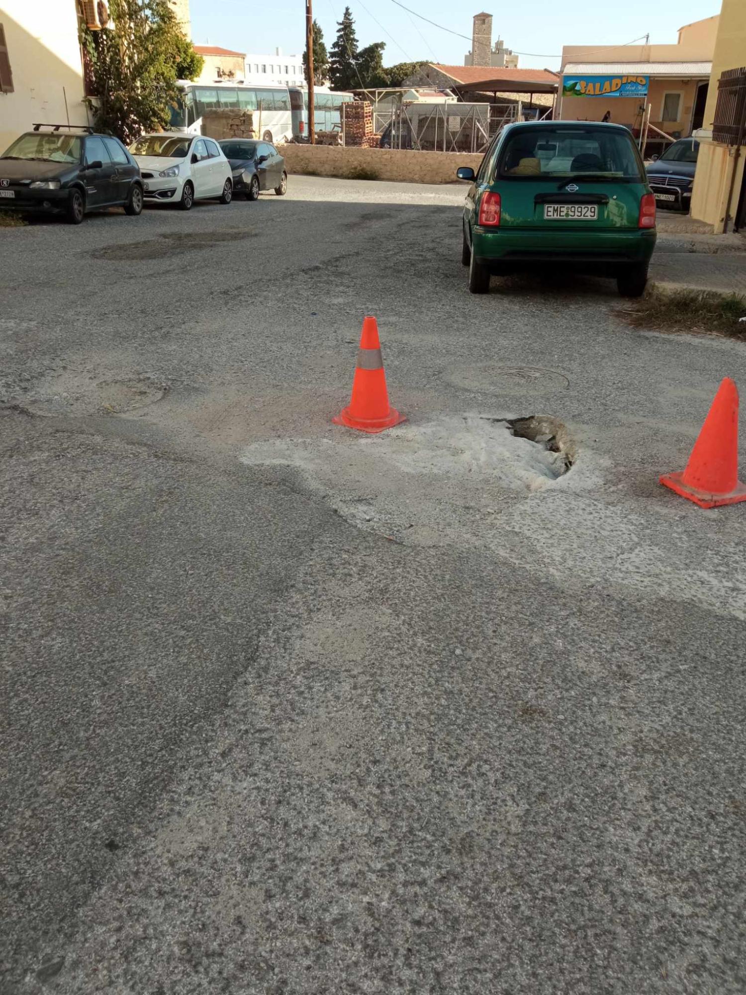 Το πλέον θλιβερό βέβαια είναι πως το επικίνδυνο τμήμα του οδοστρώματος επισημαίνεται με μόλις δύο πορτοκαλί κώνους, οι οποίοι βέβαια τις βραδινές ώρες δεν γίνονται εγκαίρως αντιληπτοί από τους οδηγούς καθώς οι ανακλαστικές ταινίες αγνοούνται…