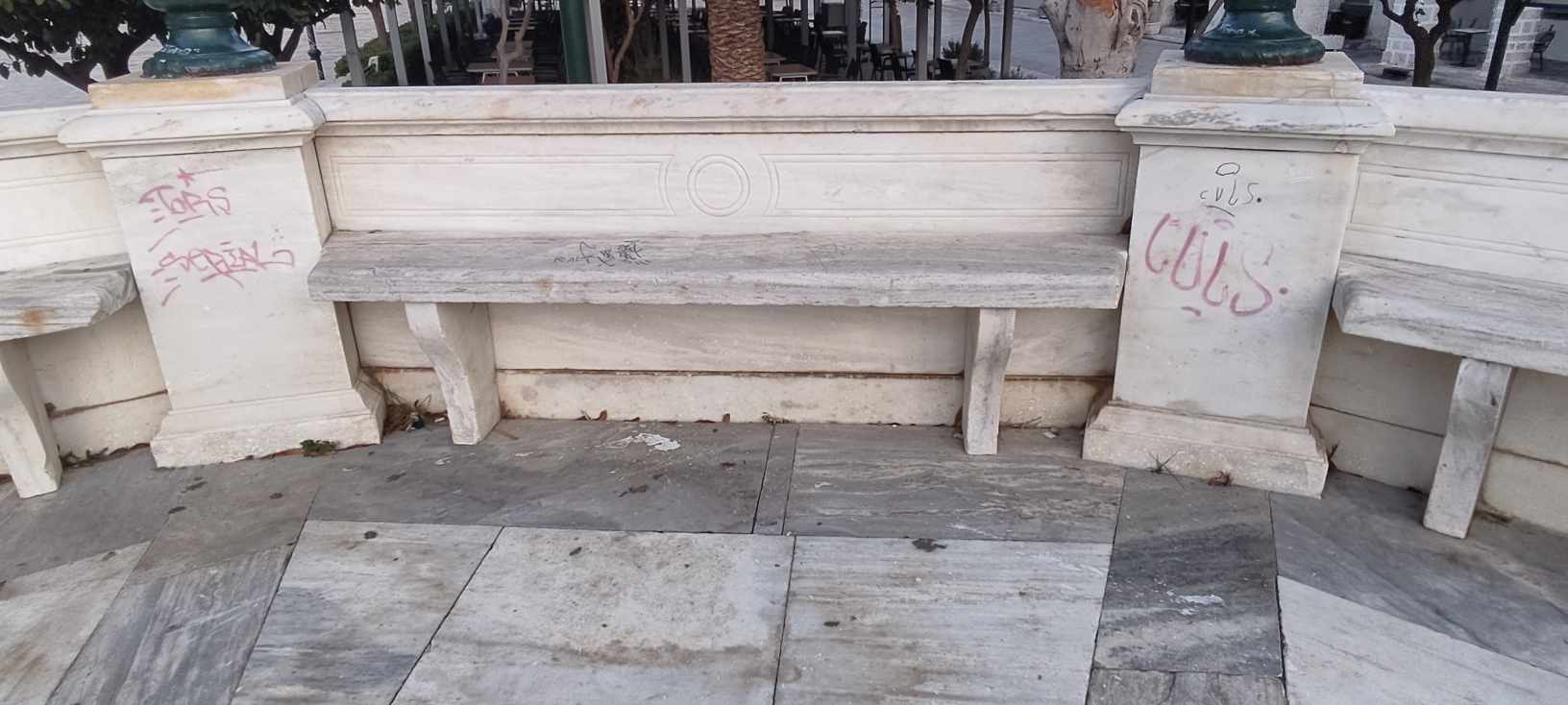 Απερίγραπτη είναι η συμπεριφορά νέων που συχνάζουν στην πλατεία Μιαούλη και οι οποίοι προχωρούν σε καταστροφές σε πολύ σημαντικά τμήματά της, όπως άλλωστε ένα εξ αυτών αποτελεί και η μαρμάρινη μουσική εξέδρα.