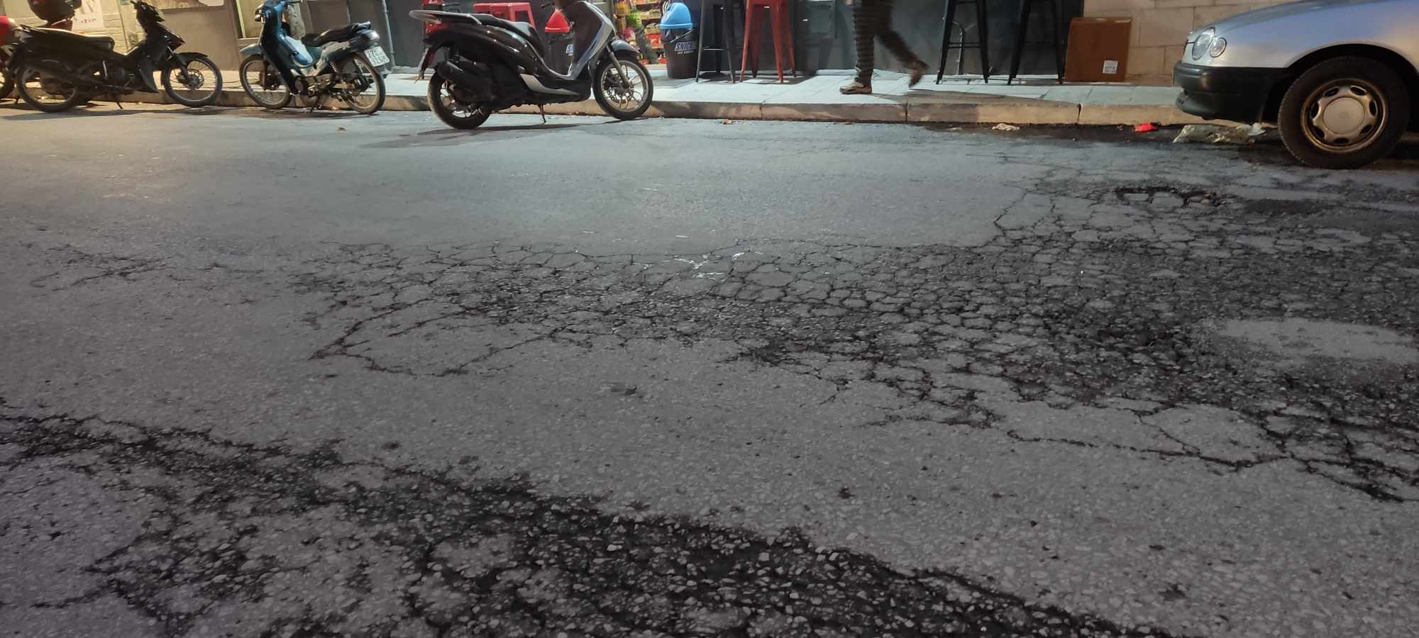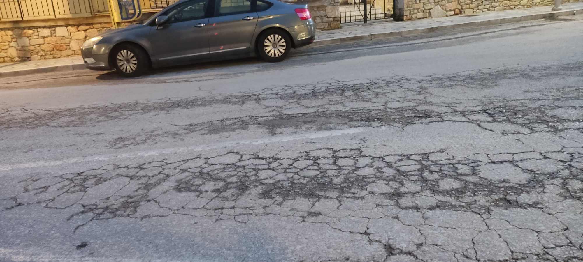Ουσιαστικά, ο δρόμος φέρει μεγάλες φθορές, τμήματα της ασφάλτου είναι αποκολλημένα, ενώ υπάρχουν ακόμη και μικρές λακκούβες, στις οποίες “πέφτουν” οι μηχανές.
