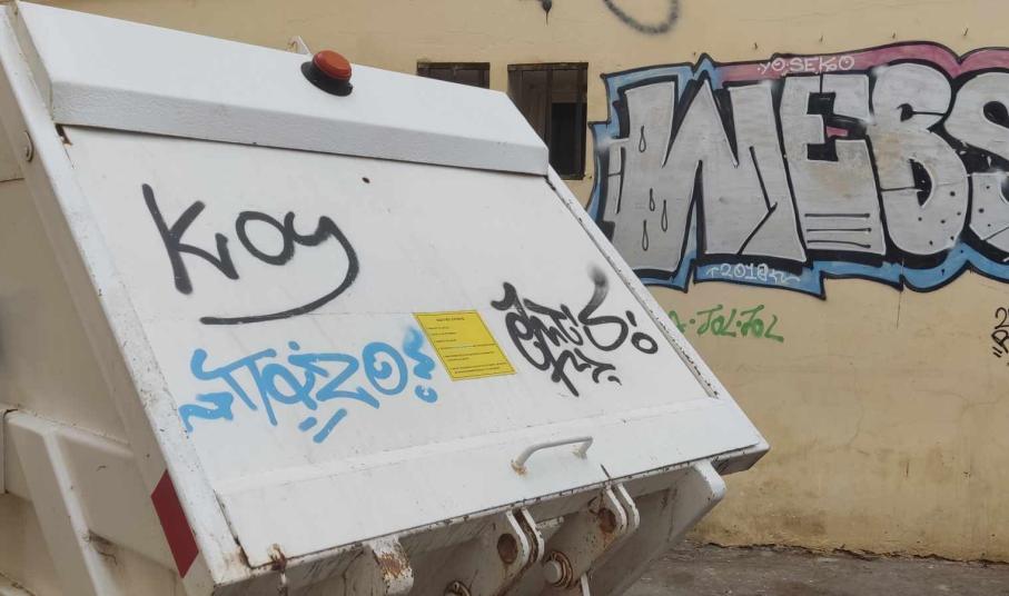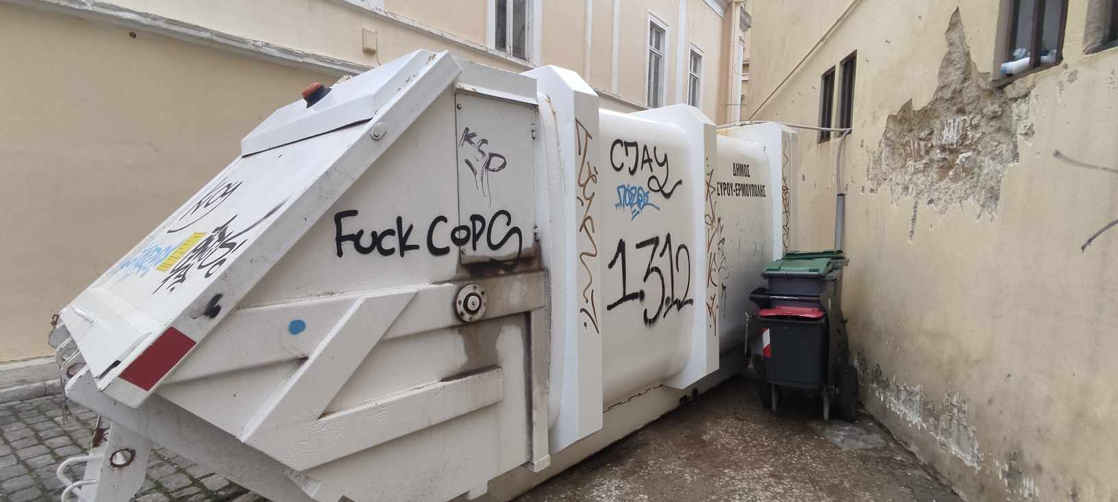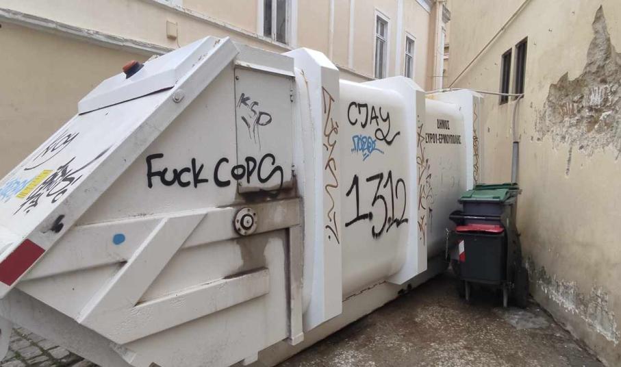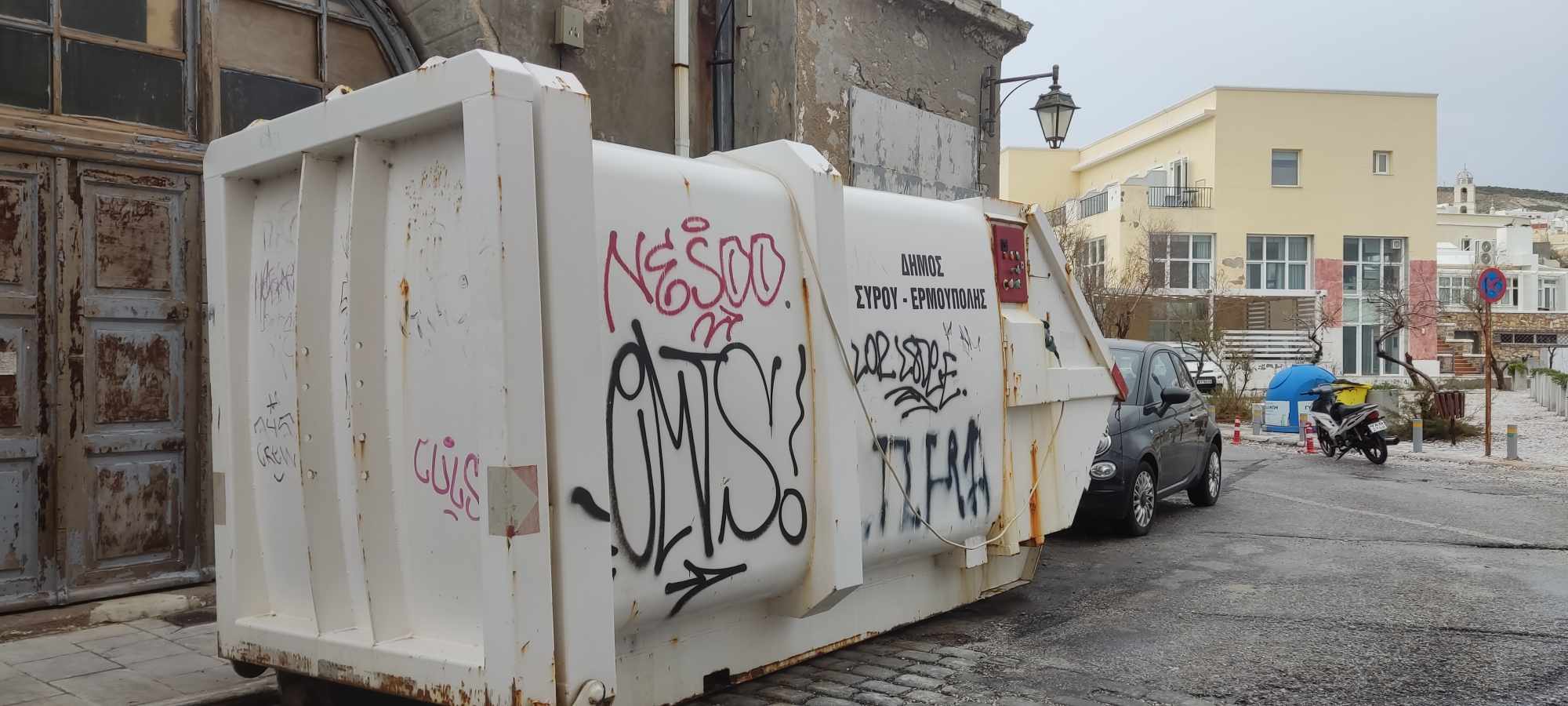 Πρόκειται για το κοντέινερ απορριμμάτων πίσω από το κτήριο του Πνευματικού Κέντρου, το οποίο φέρει παντού γκράφιτι που έγιναν με ανεξίτηλα χρώματα, αλλά και για το κοντέινερ δίπλα στην ΑΕΝ Σύρου, που παρουσιάζει ίδια εικόνα.