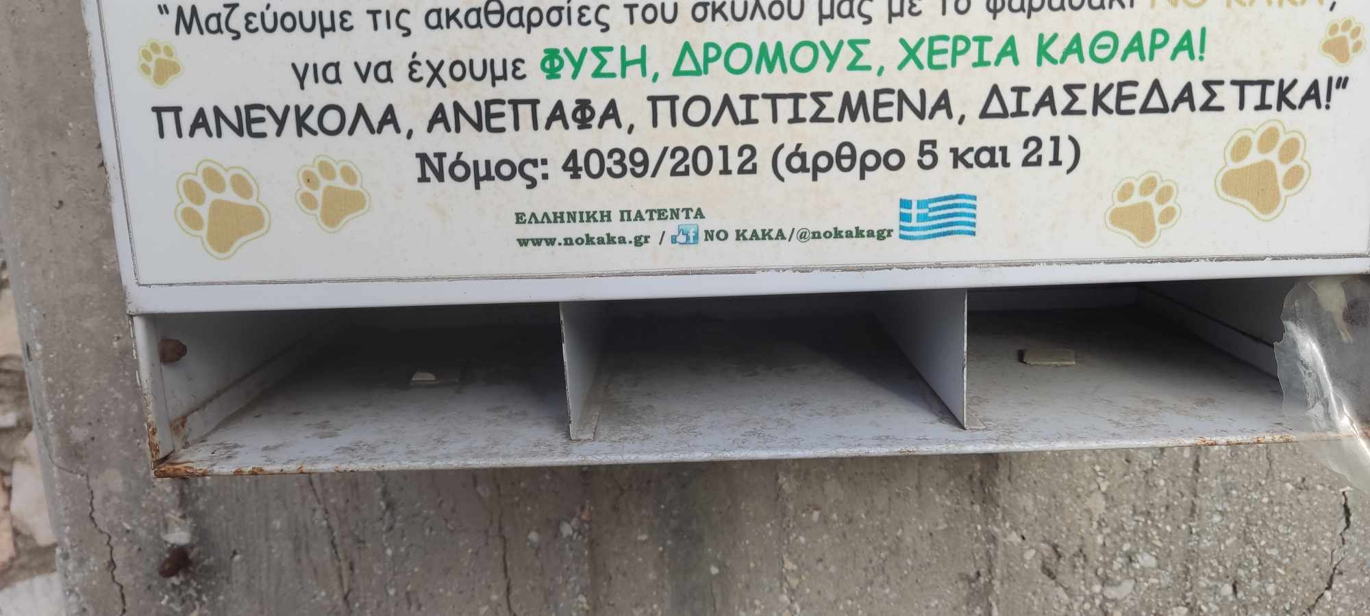 Χωρίς τον απαραίτητο εξοπλισμό για τους πολίτες που έχουν κατοικίδια, παραμένουν τα μεταλλικά κυτία NO KAKA στη Σύρο, με αποτέλεσμα, τα περιττώματα των ζώων, σε πολλές περιπτώσεις, να μη μαζεύονται από τις πλατείες και τα αλσύλλια.