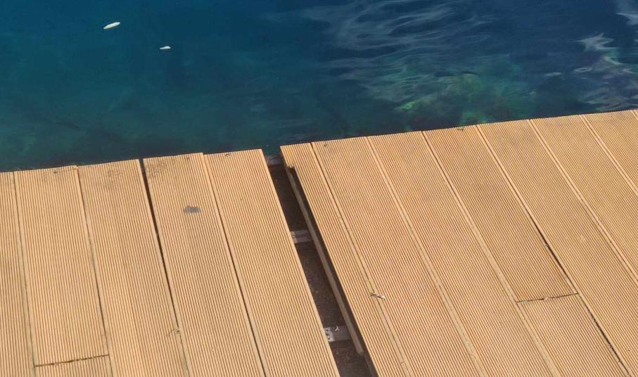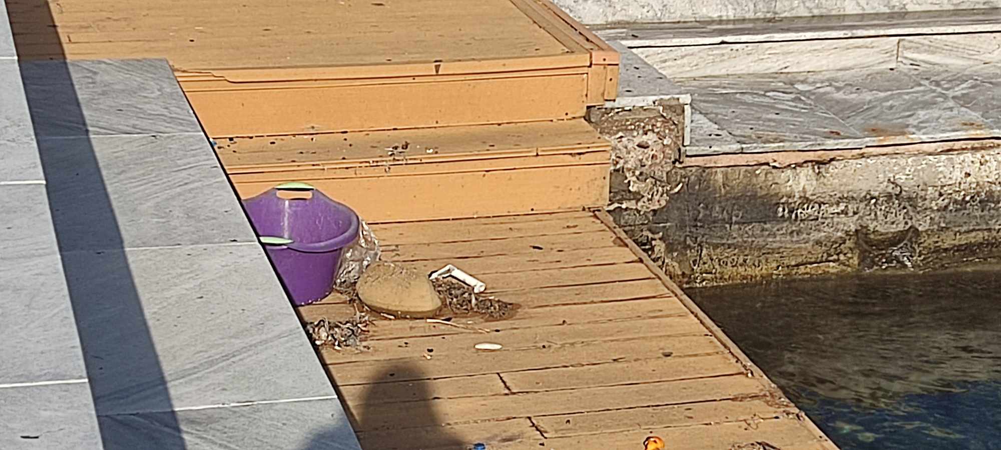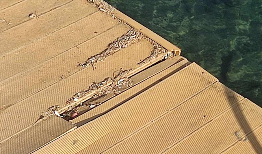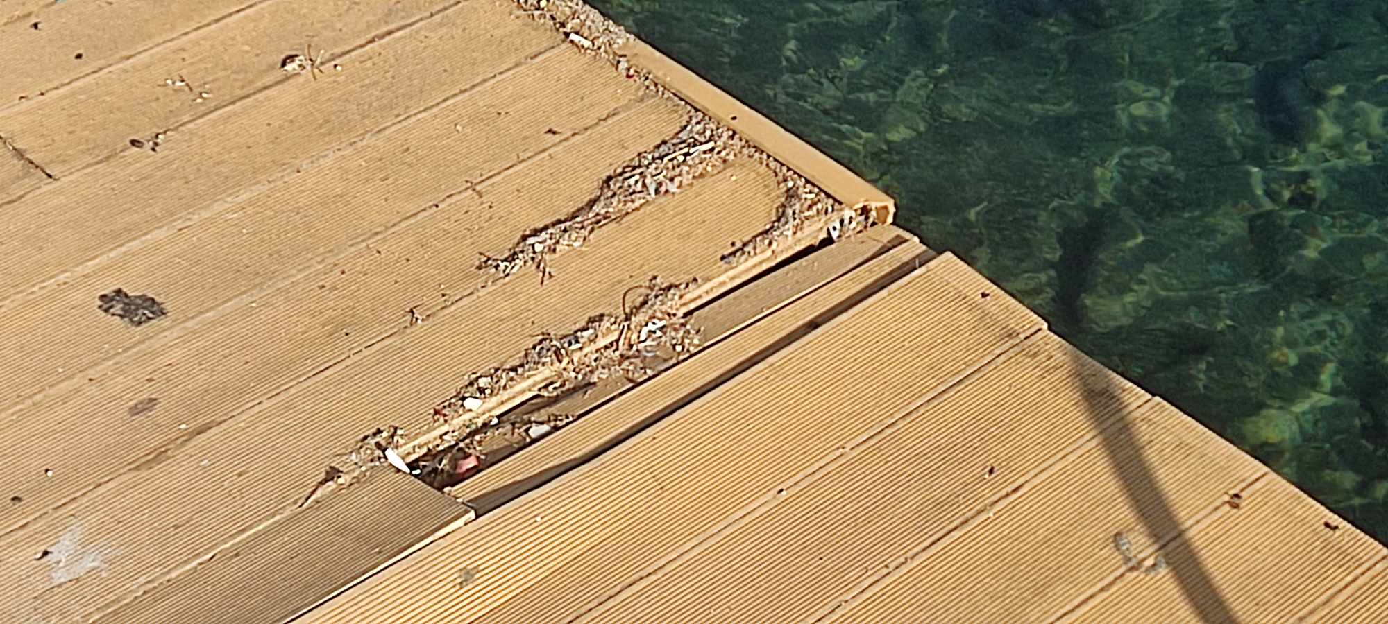 Ειδικότερα, τμήματα του ξύλινου ντεκ έχουν αποκολληθεί από τη βάση τους, ενώ άλλα, έχουν σπάσει, με αποτέλεσμα η παραμονή των λουομένων να είναι επισφαλής στο συγκεκριμένο σημείο.