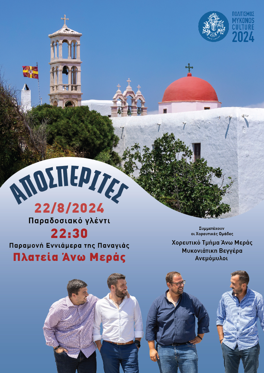 Η εκδήλωση θα ξεκινήσει με την συμμετοχή των χορευτικών τμημάτων: Χορευτικό Τμήμα ΄Ανω Μεράς, "Οι Ανεμόμυλοι", "Μυκονιάτικη Βεγγέρα"