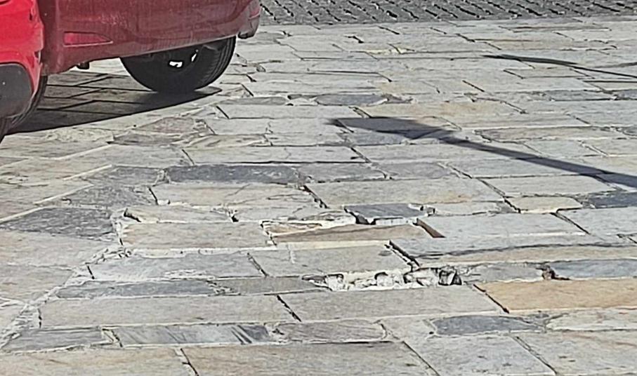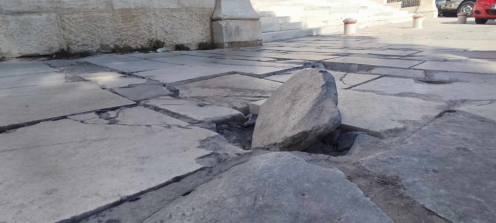 Σοβαρά “πλήγματα” δέχθηκαν ξανά τμήματα του παραδοσιακού πλακόστρωτου μπροστά από τον Ι.Ν. του Αγίου Νικολάου Ερμούπολης, καθώς η διέλευση μικρών φορτηγών και οχημάτων, προκάλεσε αποκόλληση μαρμάρινων πλακών.