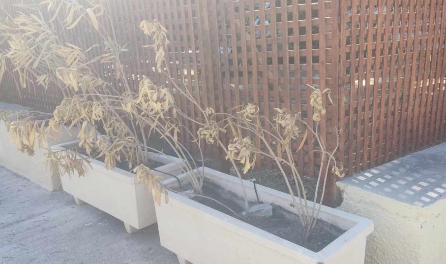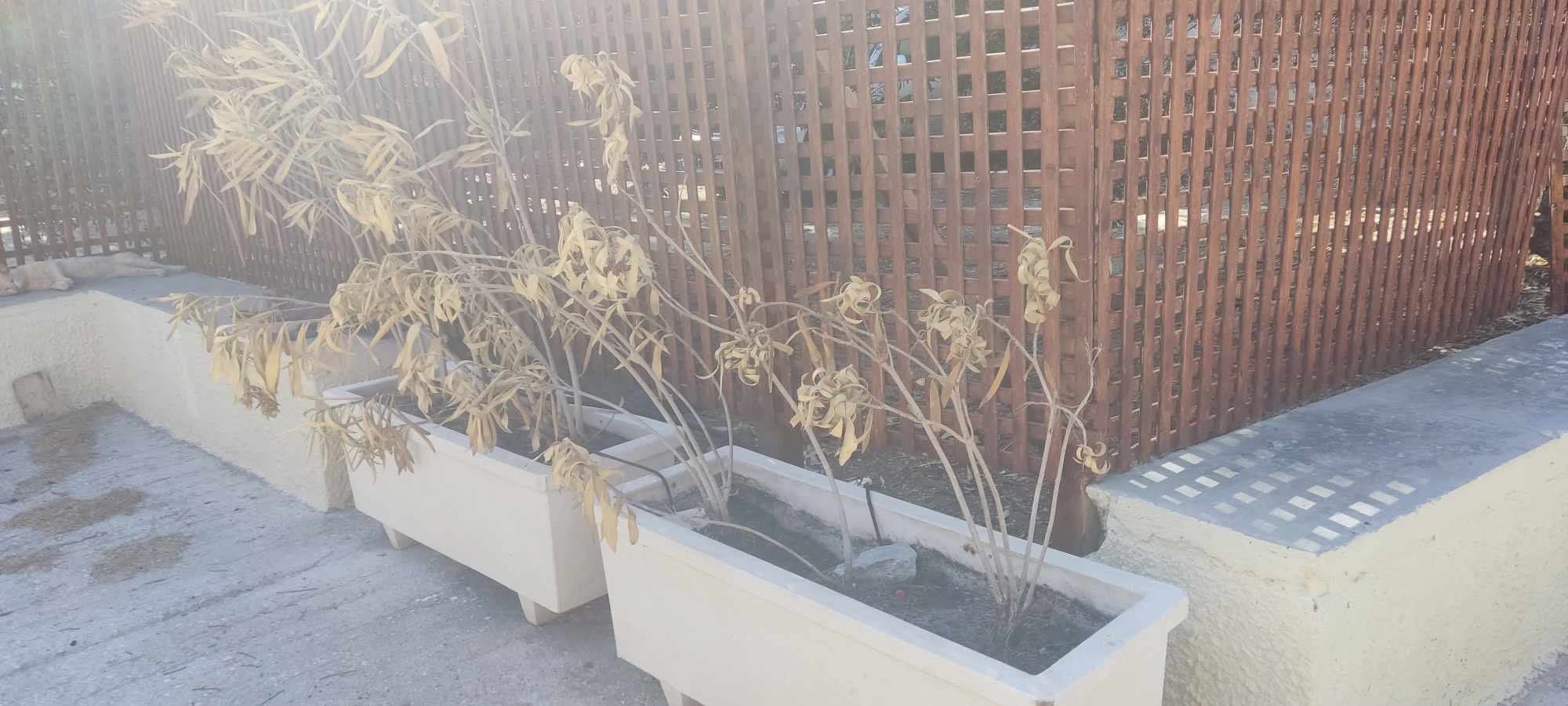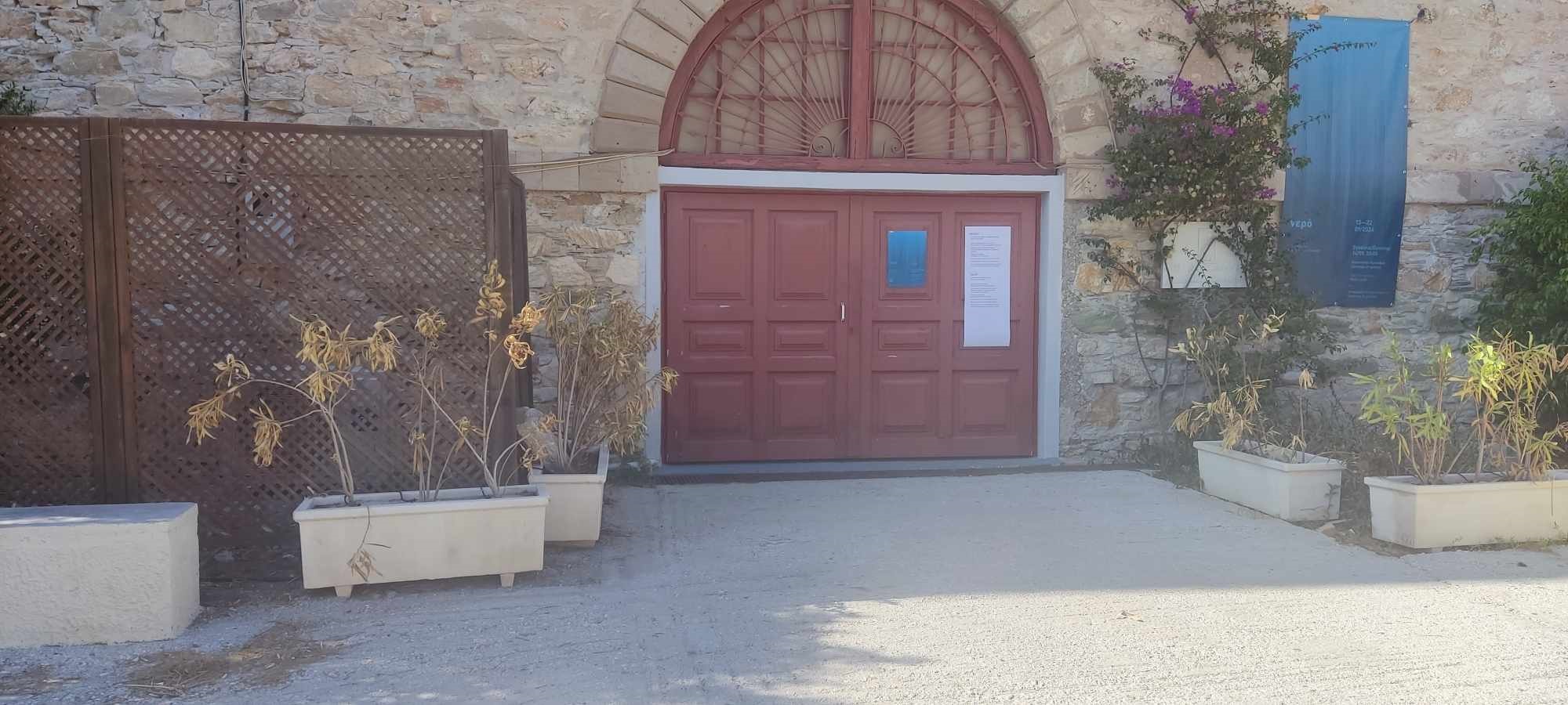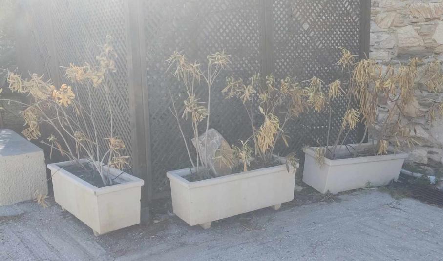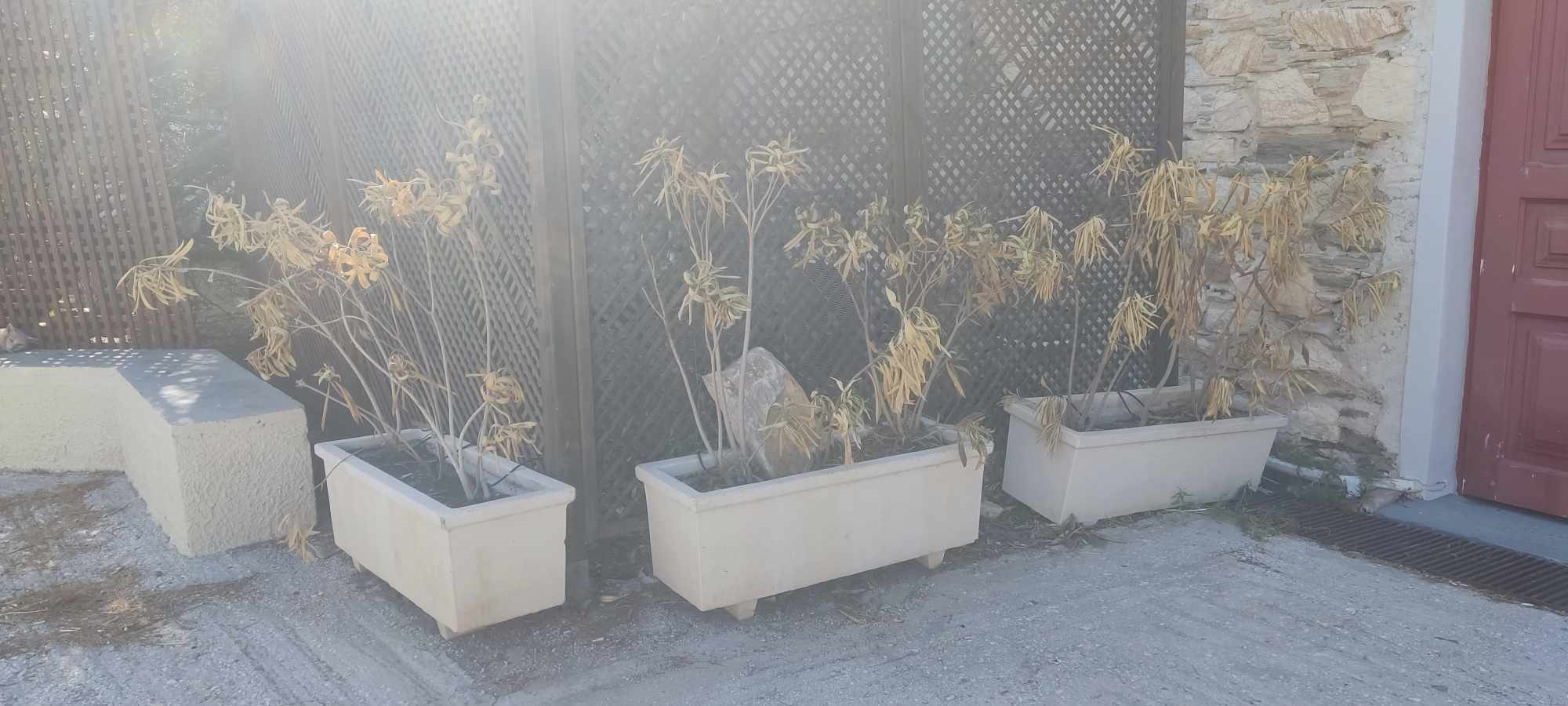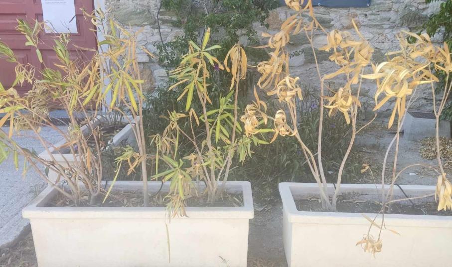 Κάκιστη είναι η εξωτερική εικόνα της εισόδου της Πινακοθήκης Κυκλάδων στη Σύρο, καθώς δεν υπάρχει καμία περιποίηση των φυτών που βρίσκονται στα παρτέρια και στις γλάστρες, με αποτέλεσμα αυτά, να έχουν ξεραθεί.