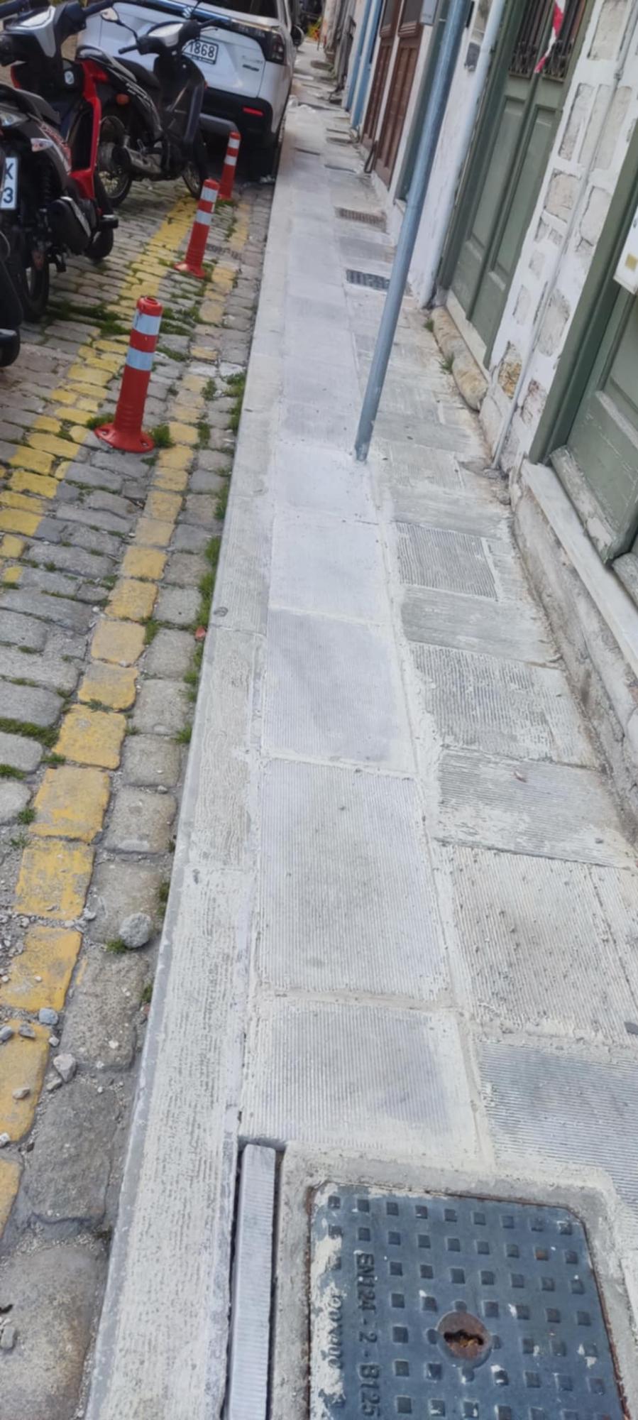 “Ανοιχτή” παραμένει η ορθή αποκατάσταση των πεζοδρομίων στις οδούς Φολεγάνδρου και Αφροδίτης, τα οποία και ανοίχτηκαν προσφάτως για το έργο της υπογειοποίησης του δικτύου φωτισμού στην Ερμούπολη, καθώς αισθητικά δεν έχουν “δέσει” με τα υπόλοιπα τμήματα.