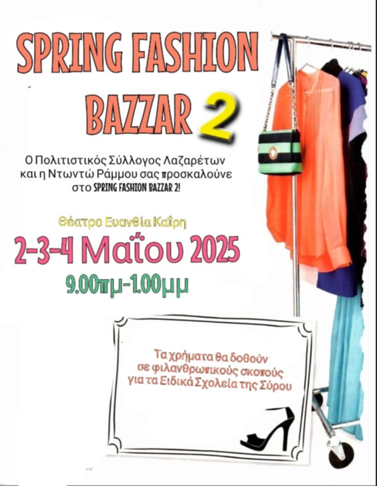 Ο Πολιτιστικός Σύλλογος Λαζαρέτων σε συνεργασία με τη Ντωντώ Ράμμου, διοργανώνει το 2ο Spring Fashion Bazaar στο θέατρο Ευανθία Καΐρη, στα Λαζαρετα, από την Παρασκευή 2 Μαΐου 2025 έως την Κυριακή 4 Μαΐου 2025, από τις 9.00πμ έως τις 1.00μμ.