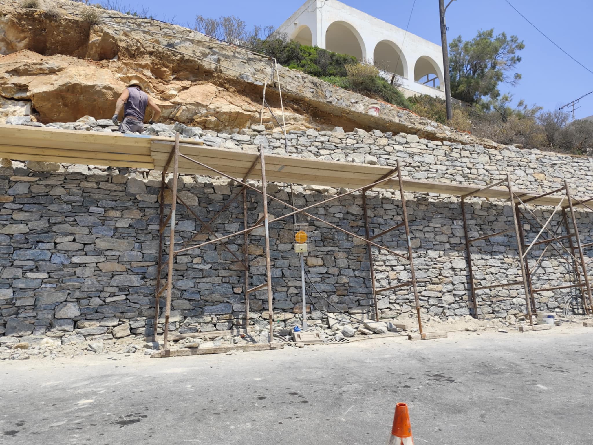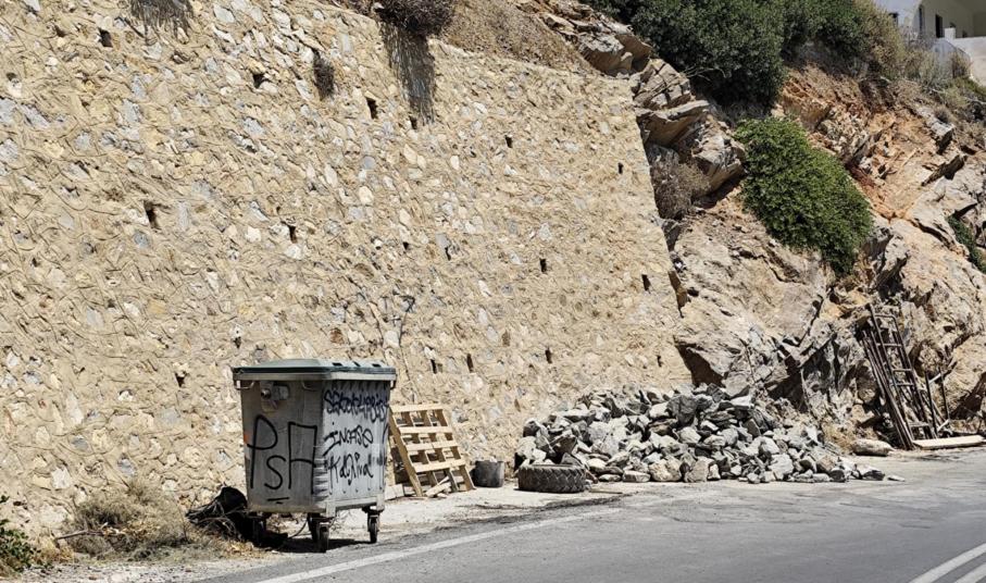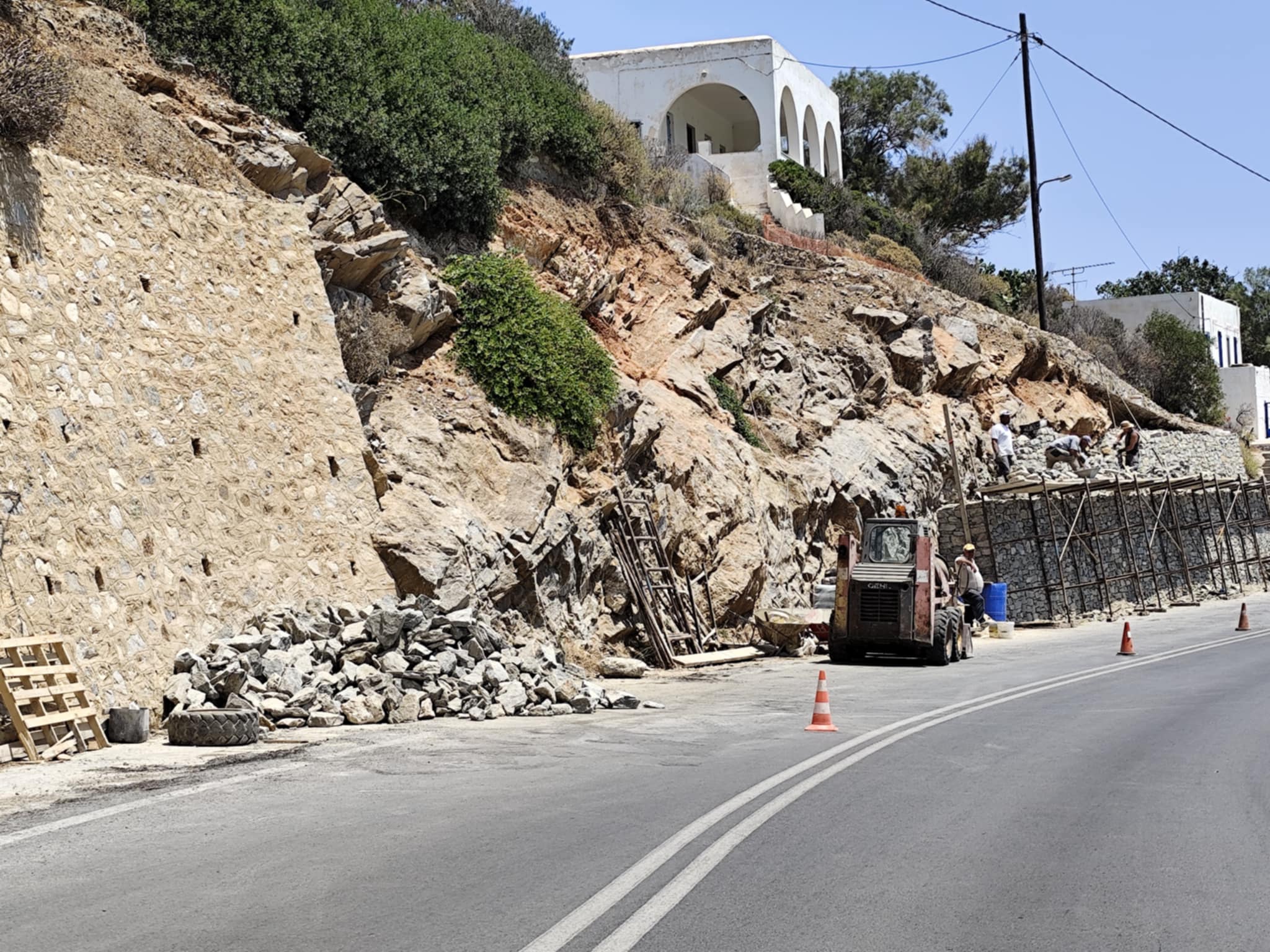 Ειδικότερα, η Περιφέρεια Ν. Αιγαίου με εργολαβία της προχώρησε αρχικά σε εργασίες σταθεροποίησης του πρανούς και στη συνέχεια στη διαμόρφωση τοιχίου, ώστε να προστατεύονται πεζοί και οδηγοί.