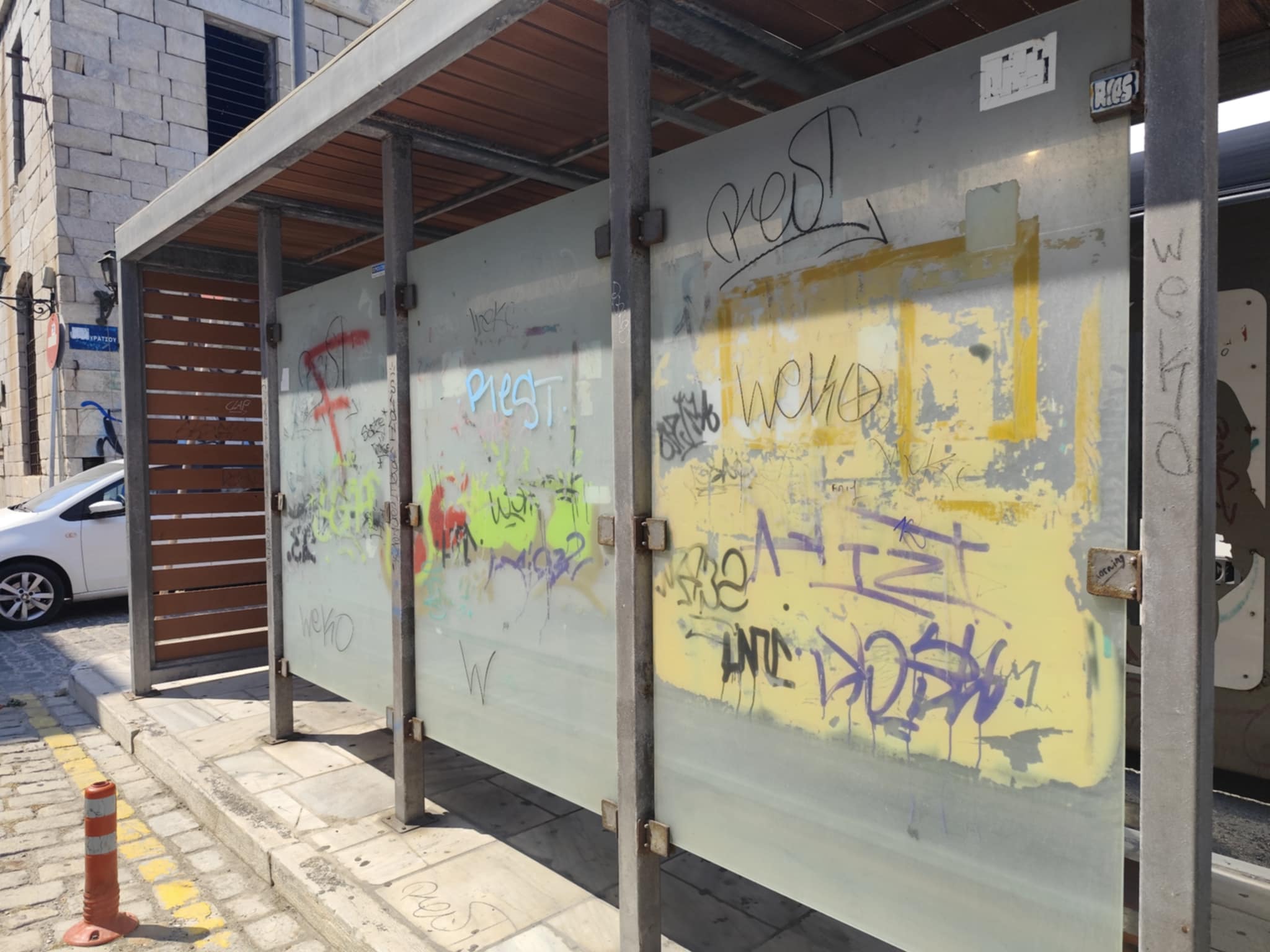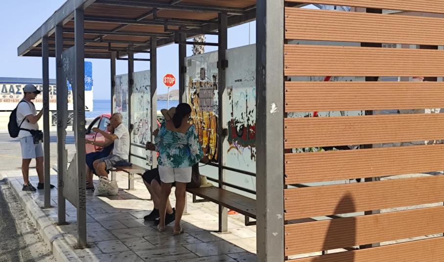 Σε κάκιστη κατάσταση έχει περιέλθει αισθητικά η στάση των επιβατών των ΚΤΕΛ Σύρου, στην Ερμούπολη, με ό,τι αυτό συνεπάγεται για την εικόνα που εισπράττουν οι ίδιοι για το νησί, κατά την αναμονή τους για τα λεωφορεία.