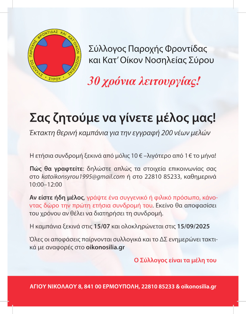 Ο Σύλλογος Κατ' Οίκον Νοσηλείας Σύρου ξεκίνησε έκτακτη δίμηνη καμπάνια για να εγγράψει τουλάχιστον 200 νέα μέλη.